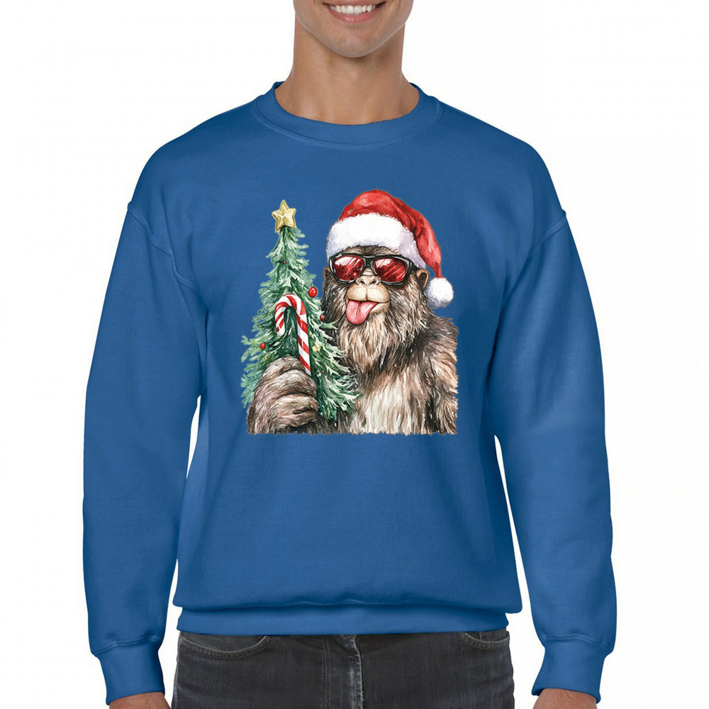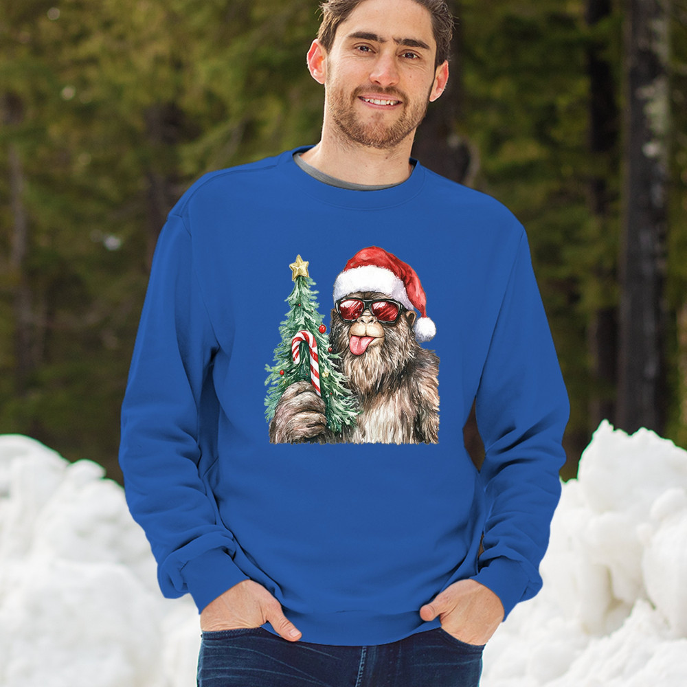 Bigfoot Christmas Santa shirt – festive Sasquatch holiday humor tee with Santa hat design, Xmas tree, candy cane, and funny Christmas style.