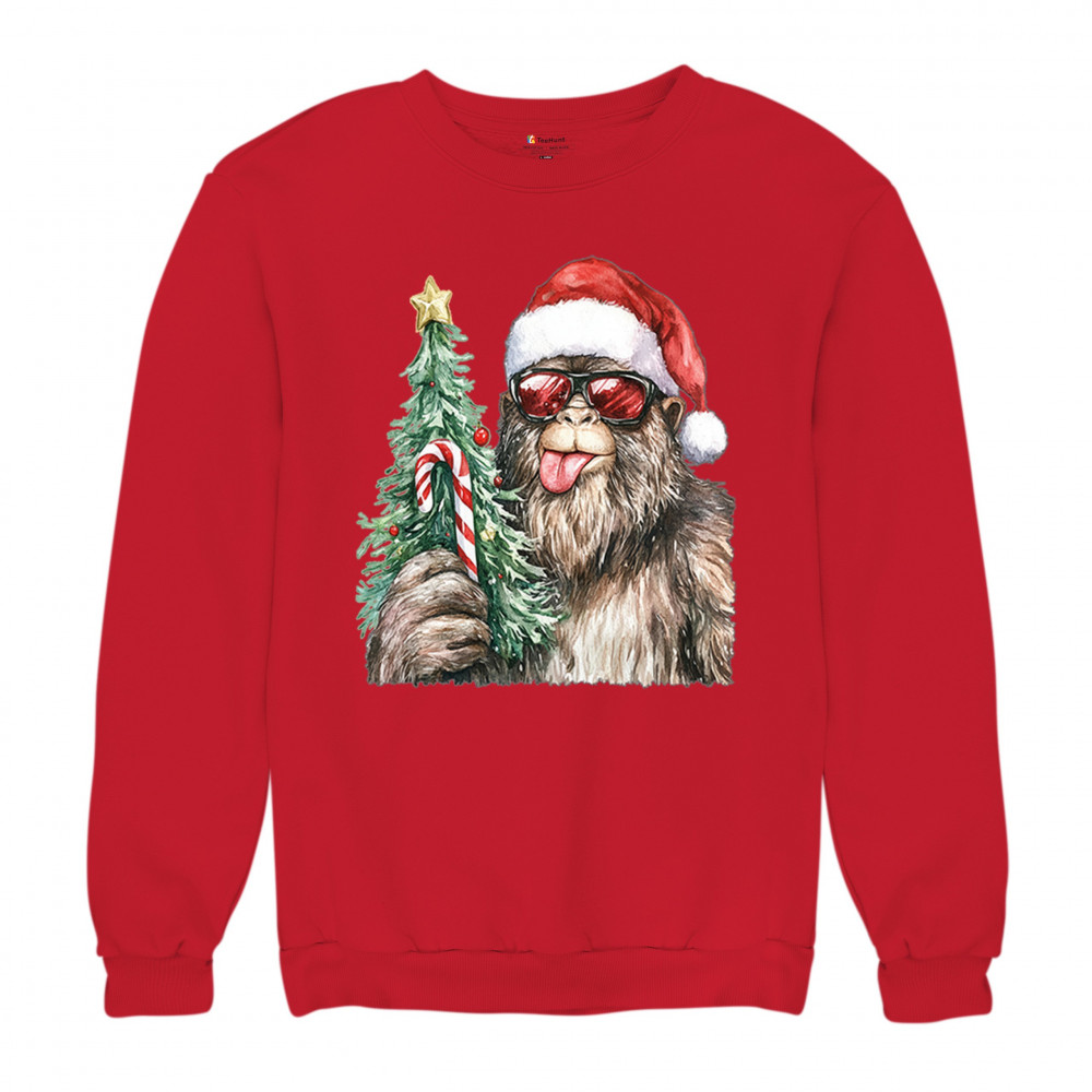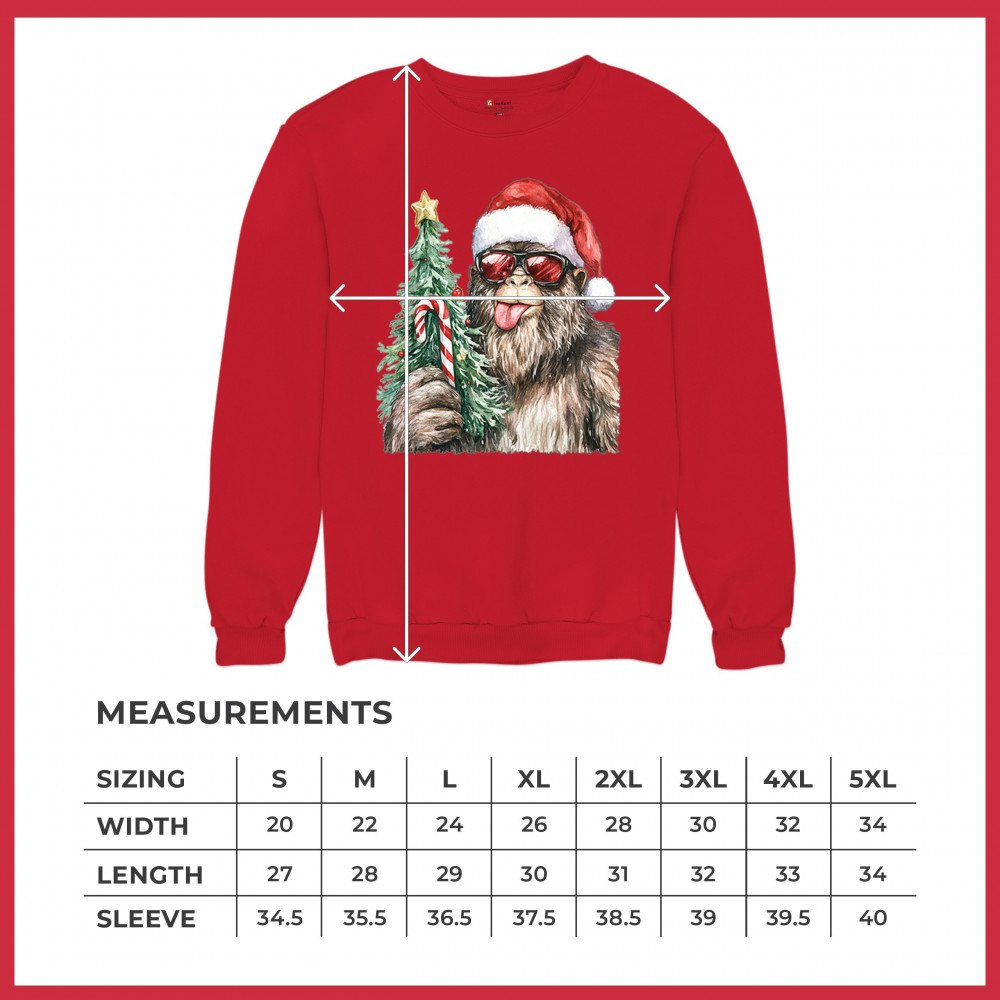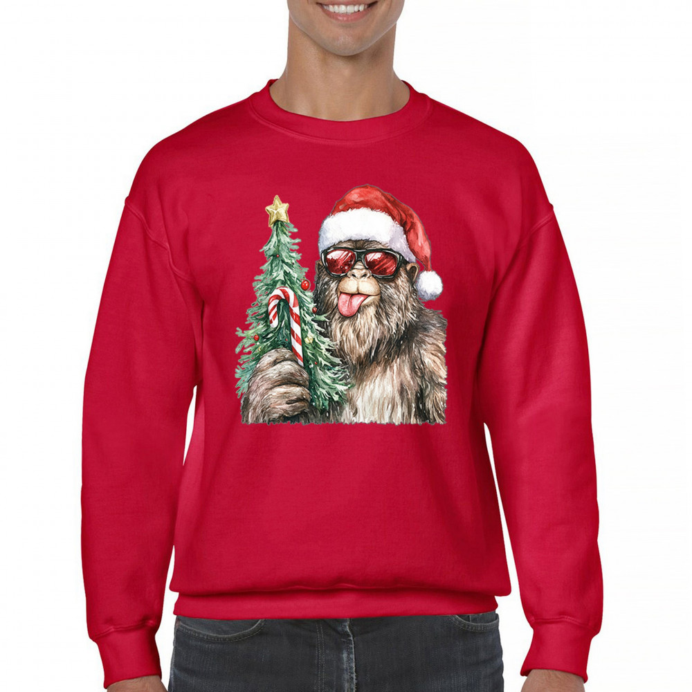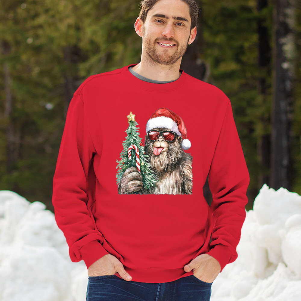 Bigfoot Christmas Santa shirt – festive Sasquatch holiday humor tee with Santa hat design, Xmas tree, candy cane, and funny Christmas style.