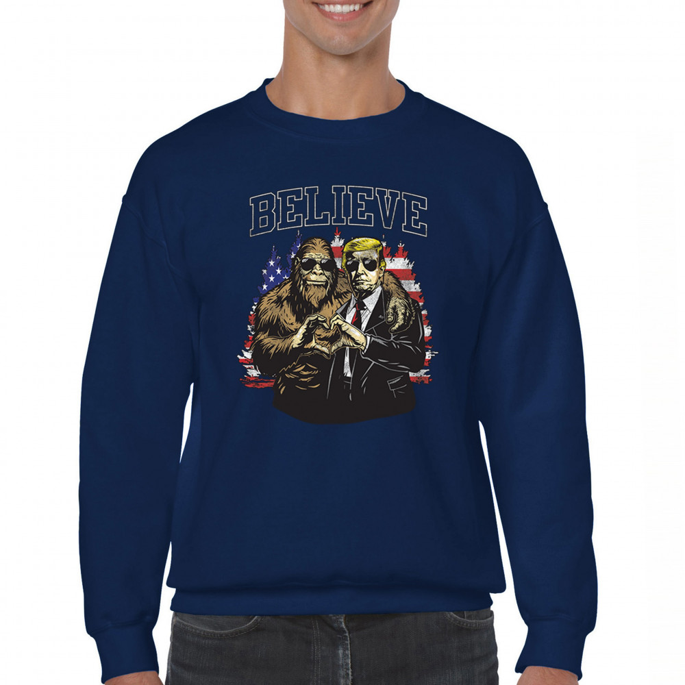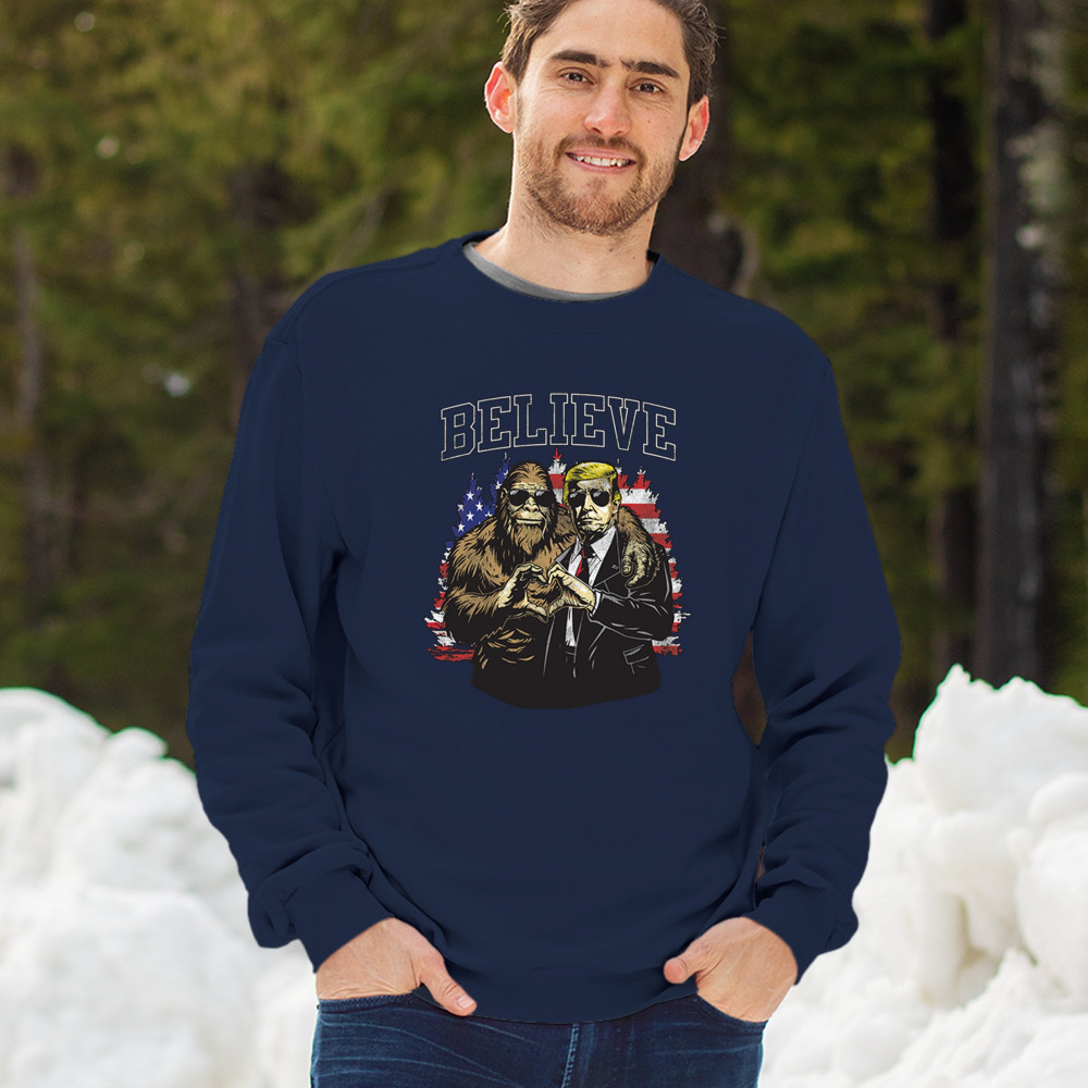 The "Believe" design combines patriotic pride and conservative values with a touch of fun. Featuring Donald J. Trump and a loyal Bigfoot against the American flag, this graphic is perfect for Trump supporters, Republicans, and believers in America First. Celebrate the Red Wave, the 47th President, and the unstoppable fight for victory. Ideal for anyone with unwavering belief in the people's mandate.