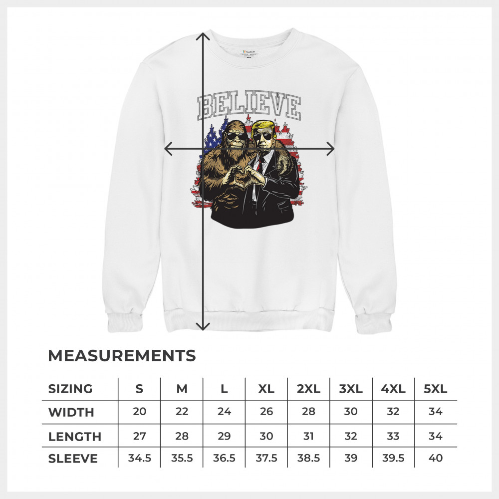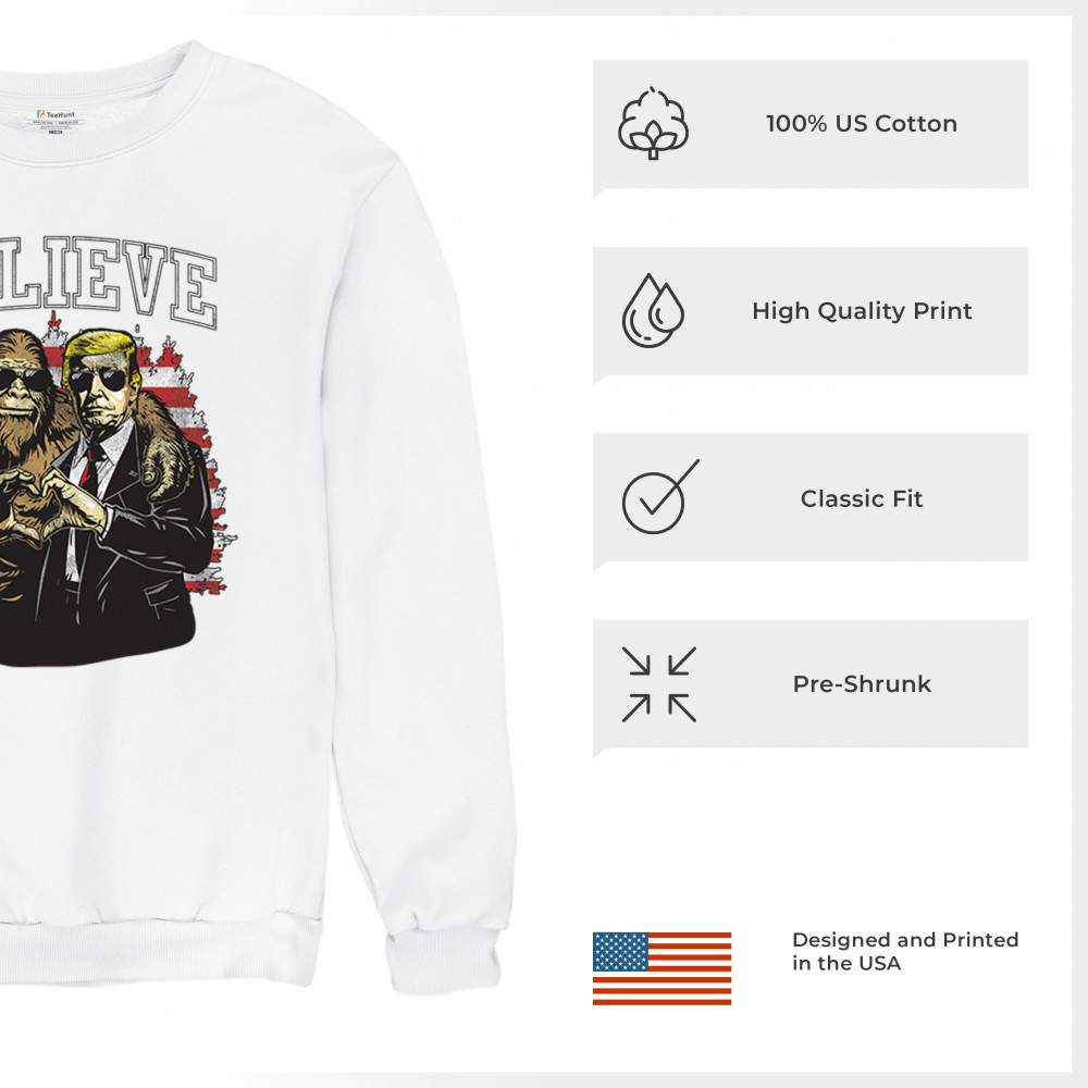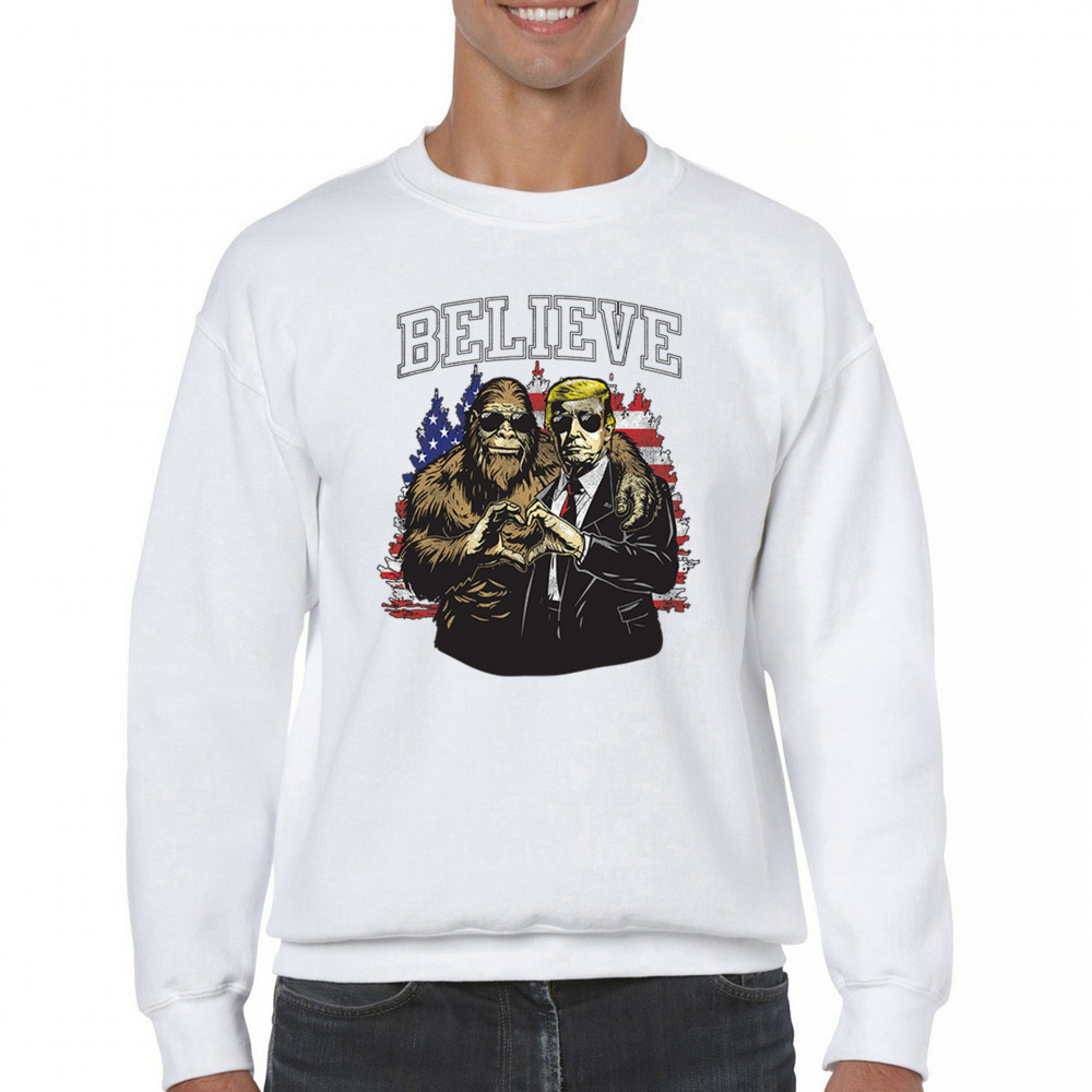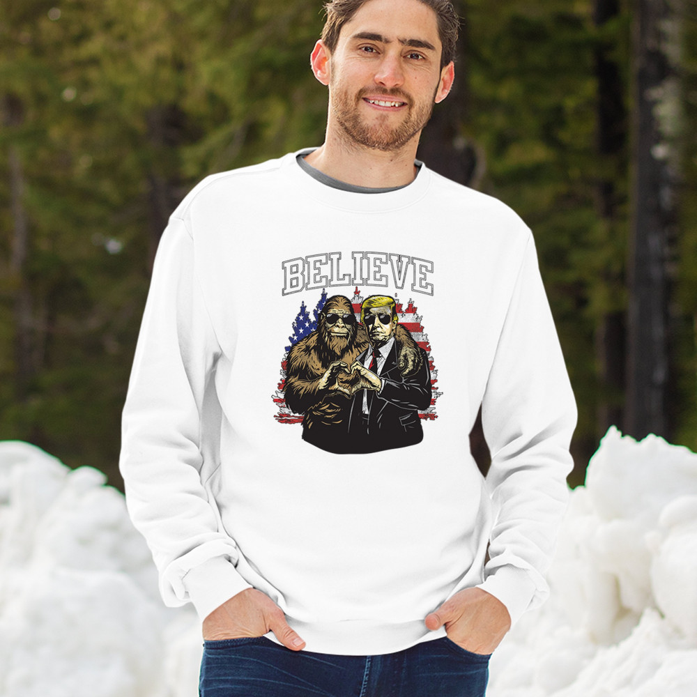 The "Believe" design combines patriotic pride and conservative values with a touch of fun. Featuring Donald J. Trump and a loyal Bigfoot against the American flag, this graphic is perfect for Trump supporters, Republicans, and believers in America First. Celebrate the Red Wave, the 47th President, and the unstoppable fight for victory. Ideal for anyone with unwavering belief in the people's mandate.
