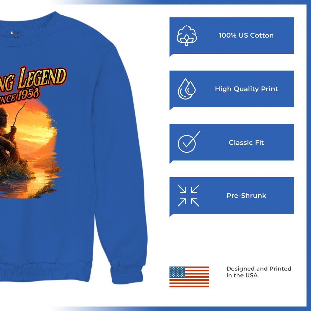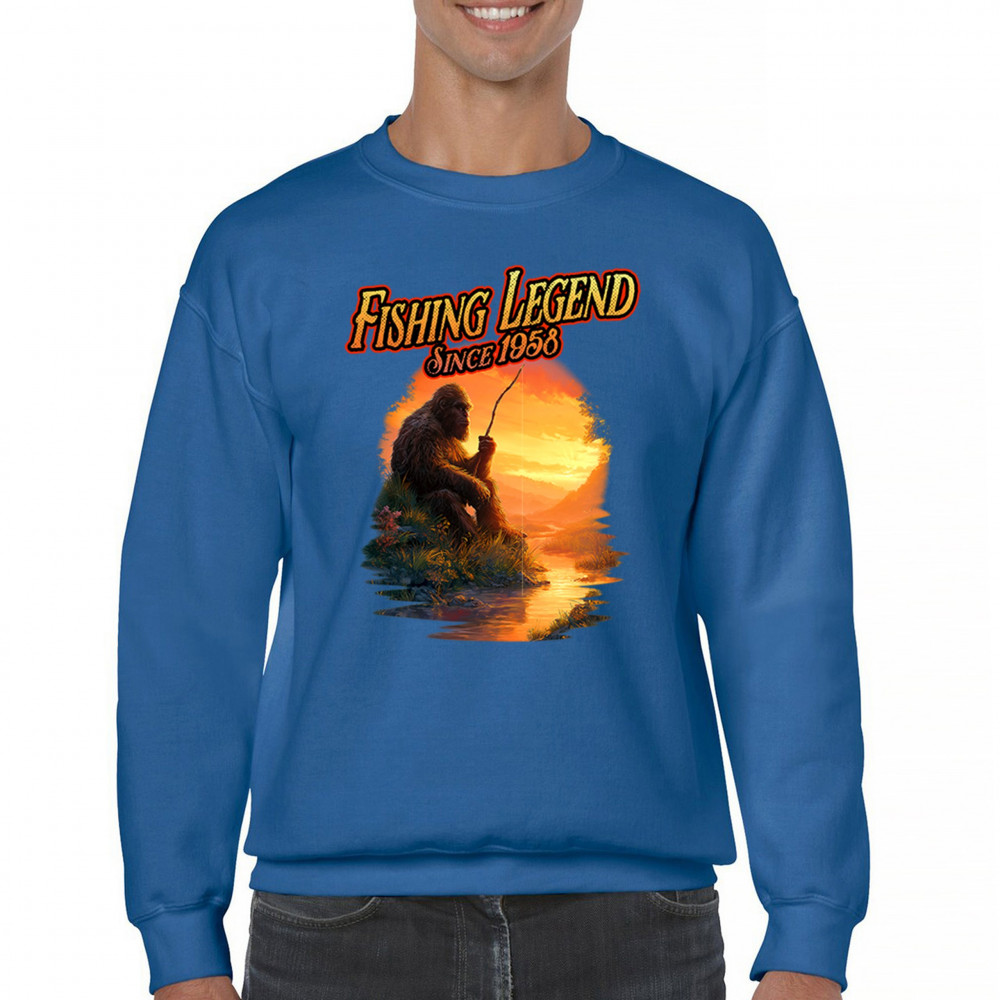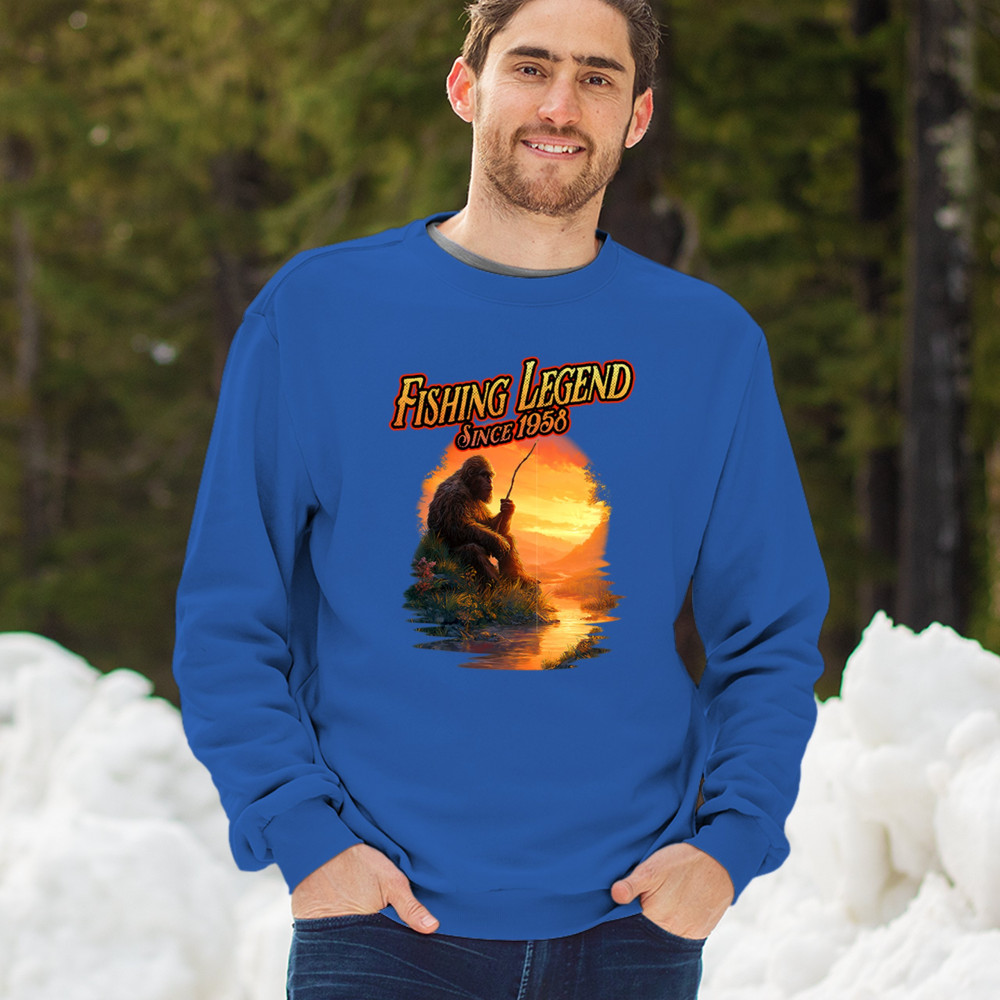 Bigfoot fishing legend design with Sasquatch lifestyle, retro vintage humor, funny wilderness shirt, Father’s Day gift, and campfire style.