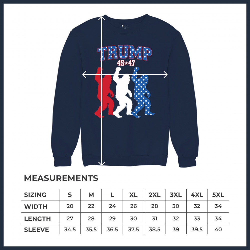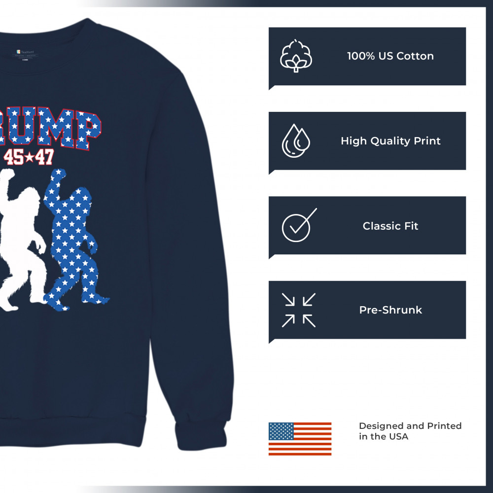 Unite humor and patriotism with the Trump 45/47 Bigfoot design! Featuring bold red, white, and blue Bigfoot silhouettes adorned with American flag stars, this eye-catching design supports Donald J. Trump, the Republican party, and the Red Wave movement. Embrace the fight for common sense, America First, and the people's mandate with this unique and fun statement piece.