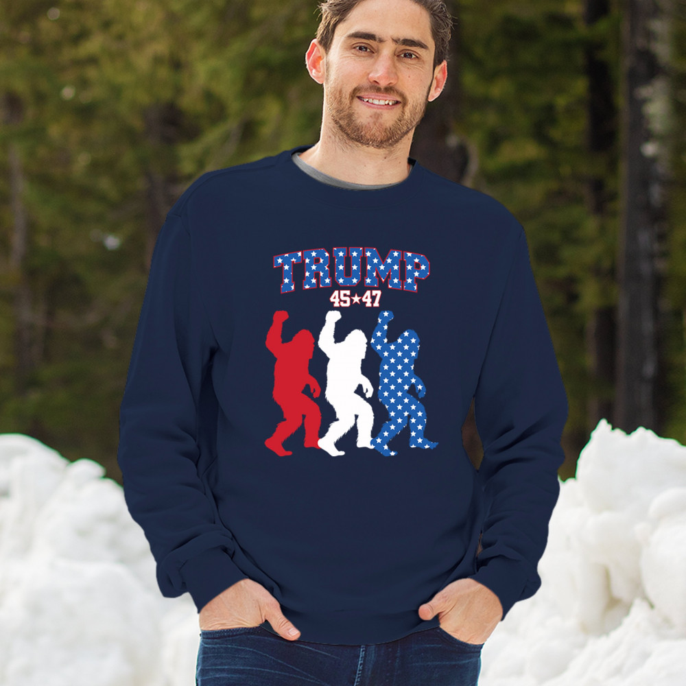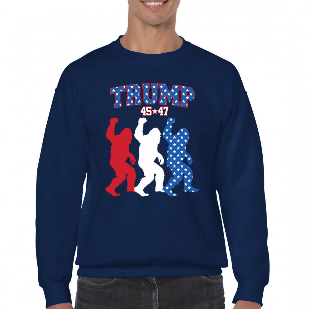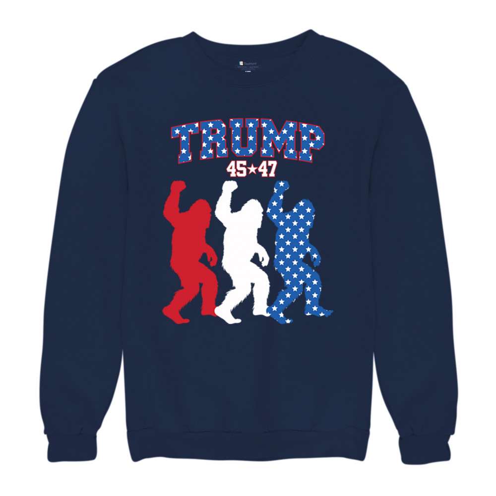 Trump 45/47 Bigfoot design in red, white, and blue with American flag stars. Celebrate patriotism, humor, and the fight for America First values.