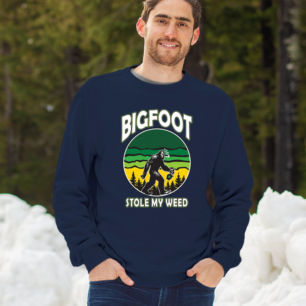 Humorous "Bigfoot Stole My Weed" design featuring Bigfoot and a cannabis leaf. Perfect for fans of Mary Jane, stoned humor, and a chill lifestyle.