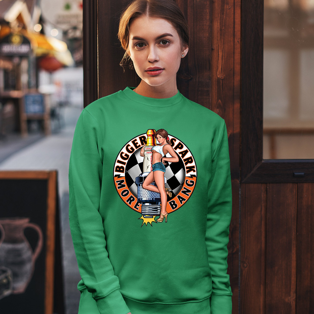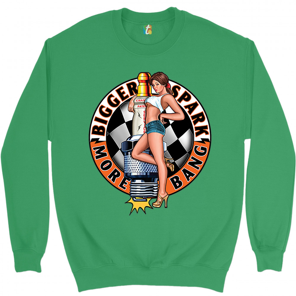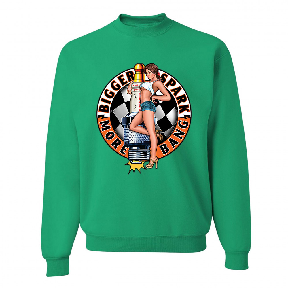 BIGGER SPARK MORE BANG sweatshirt pin-up girl vintage automotive crewneck green