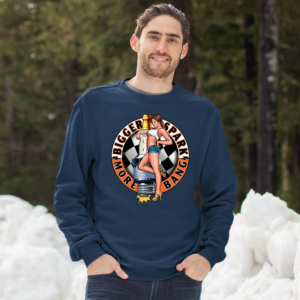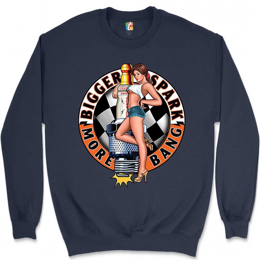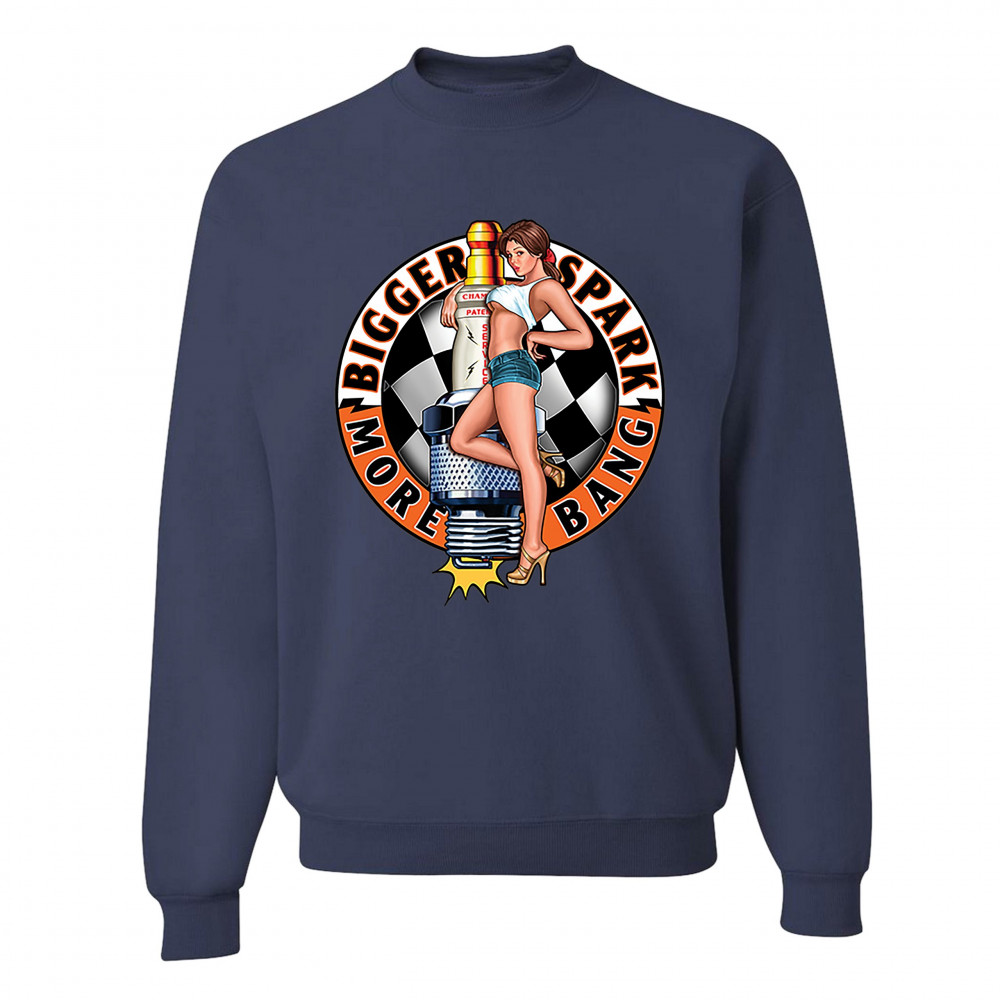 BIGGER SPARK MORE BANG sweatshirt pin-up girl vintage automotive crewneck navy blue