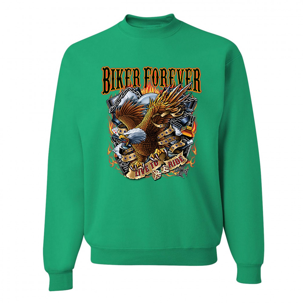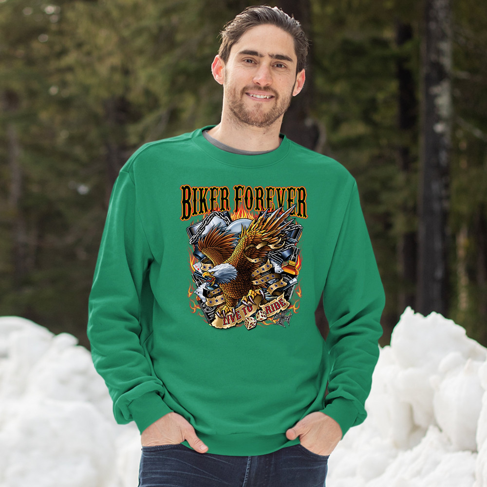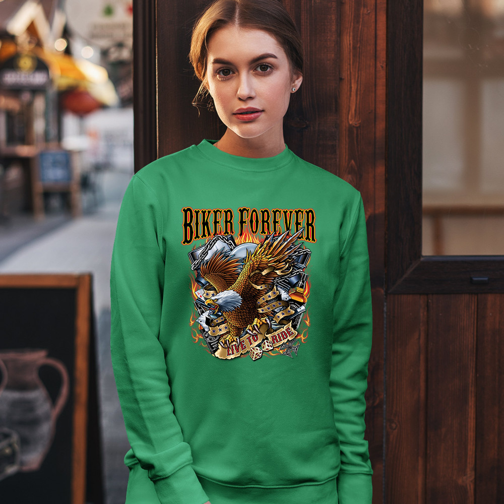 A print featuring an American bald eagle, holding a stripe with "live to ride" written on it, a v-engine in the background, a pair of dice and playing cards. At the top the print says: "biker forever". A great choice for a motorcycle enthusiast.