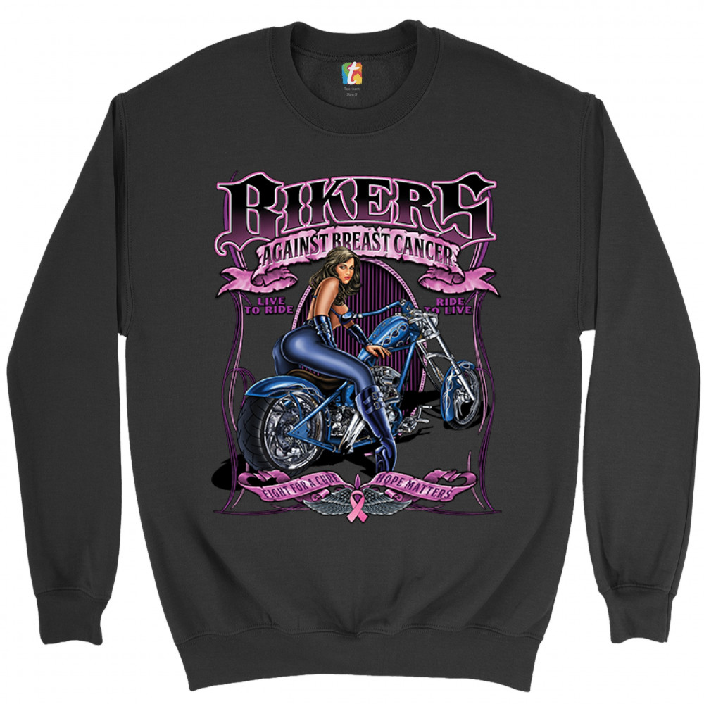A print featuring a badass biker chick leaning on a chopper. The print says: "Bikers against breast cancer. Live to ride. Ride to live." At the bottom of the print there are two stripes with "fight for a cure, hope matters" written on them. Between the st
