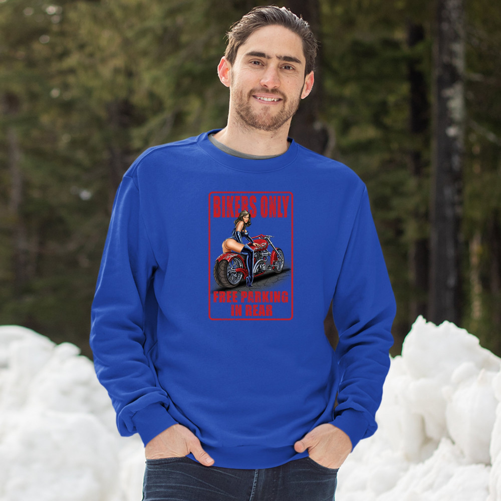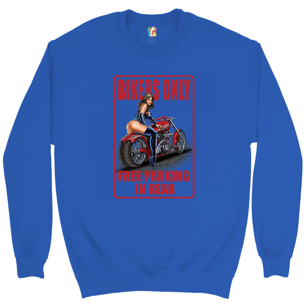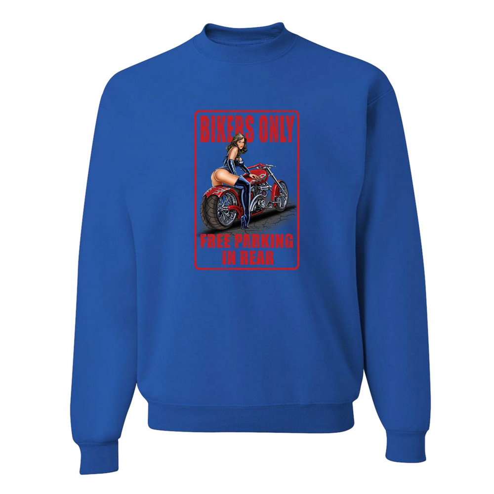 BIKERS ONLY FREE PARKING IN REAR sweatshirt funny pin-up biker chick crewneck royal blue