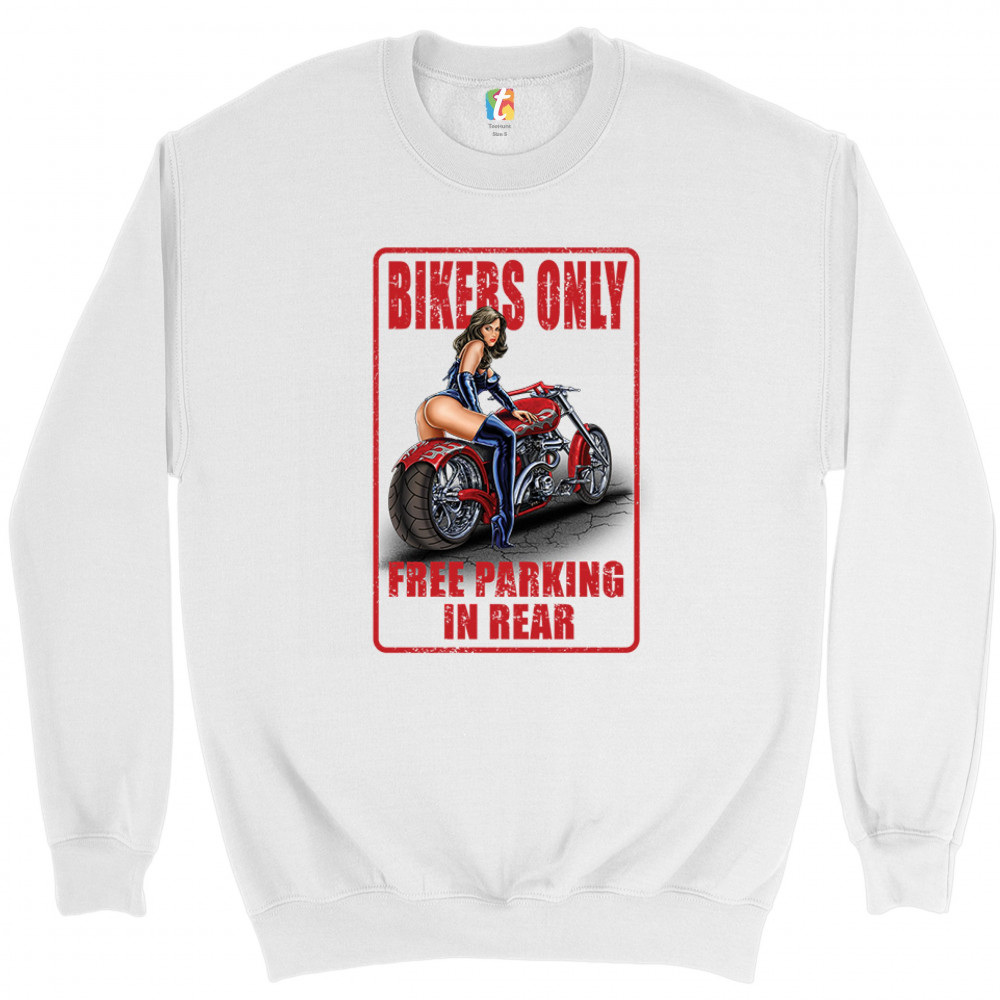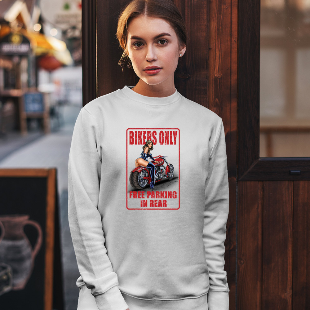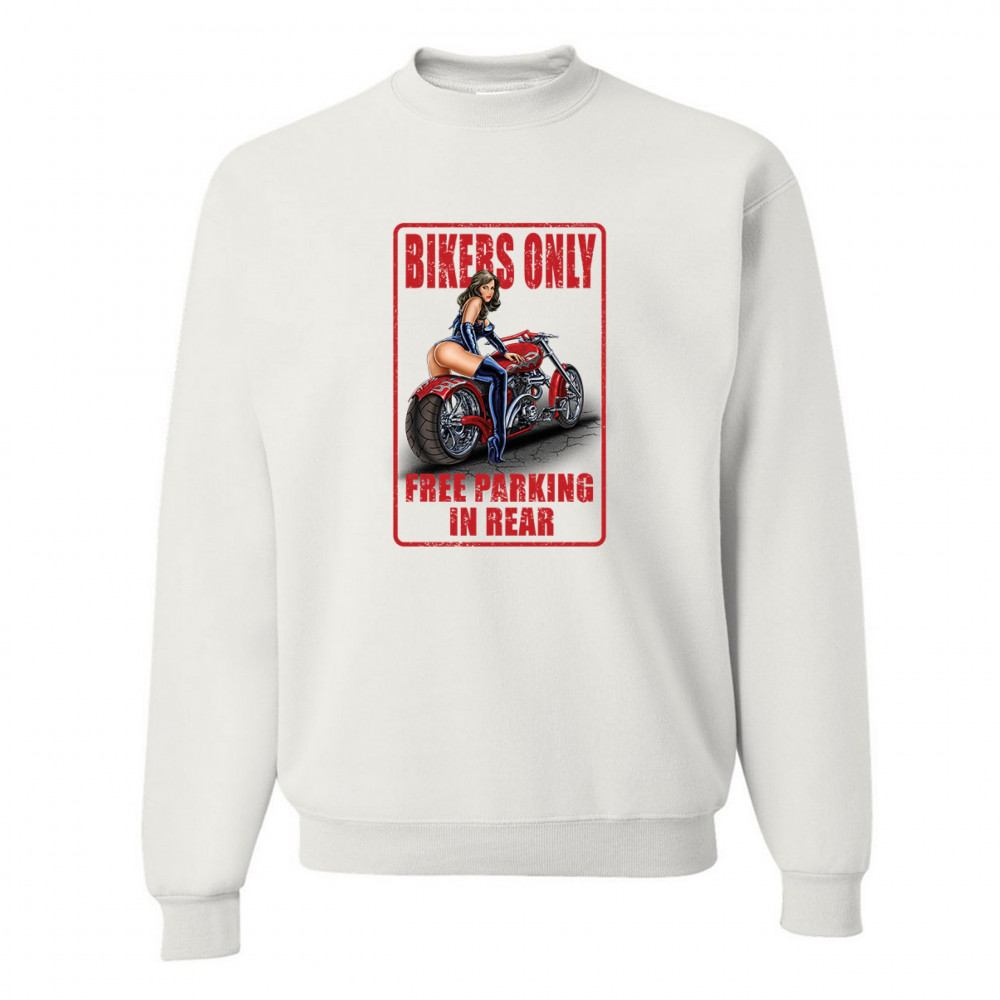 BIKERS ONLY FREE PARKING IN REAR sweatshirt funny pin-up biker chick crewneck white