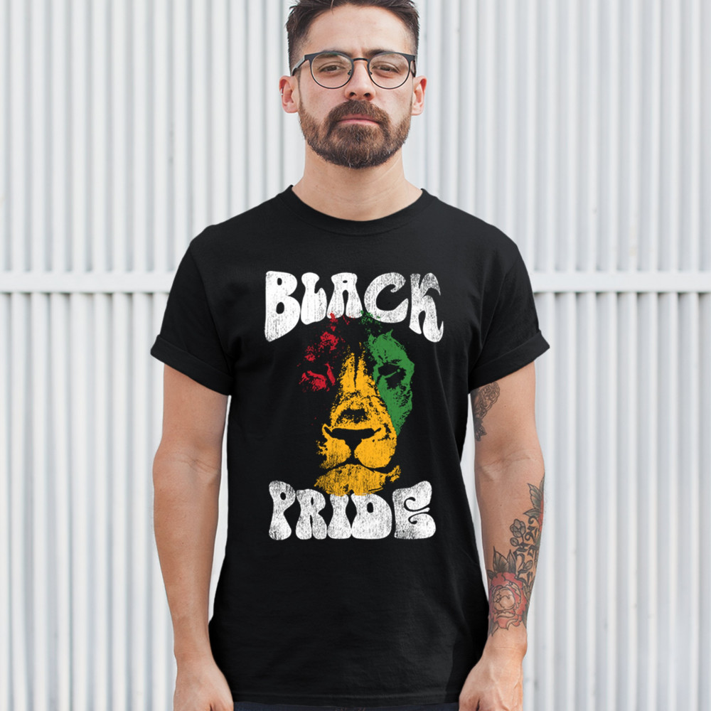 A political print saying: "Black Pride" and featuring a lion's face painted with the Pan-African colors. Great choice to wear to spread an important message.