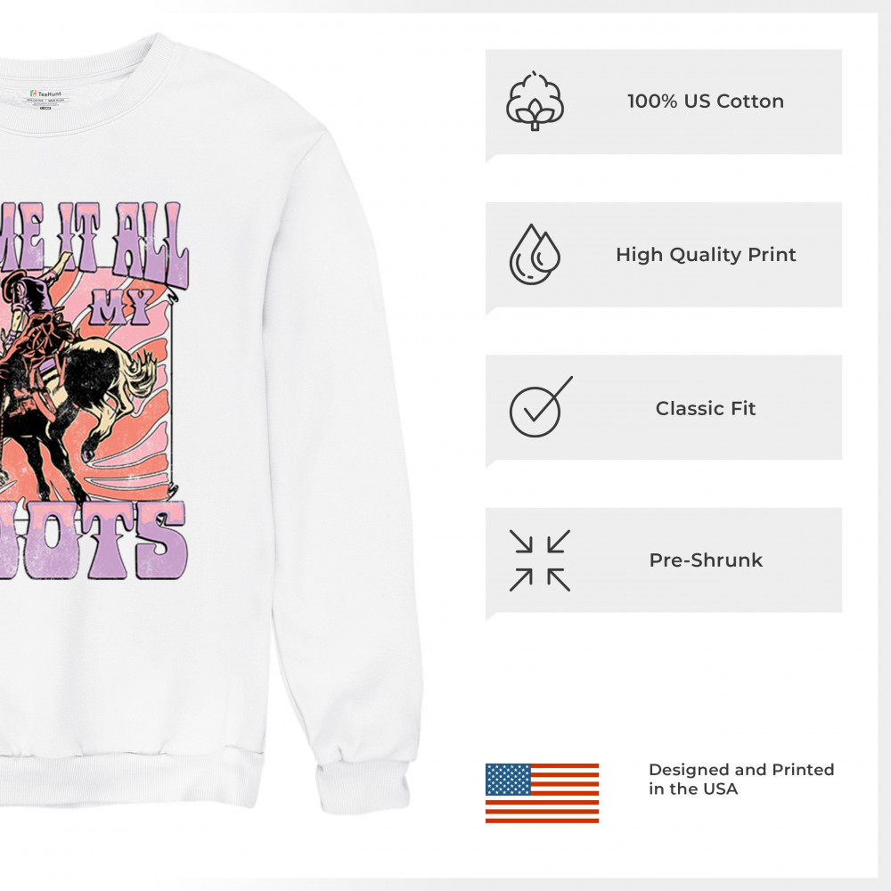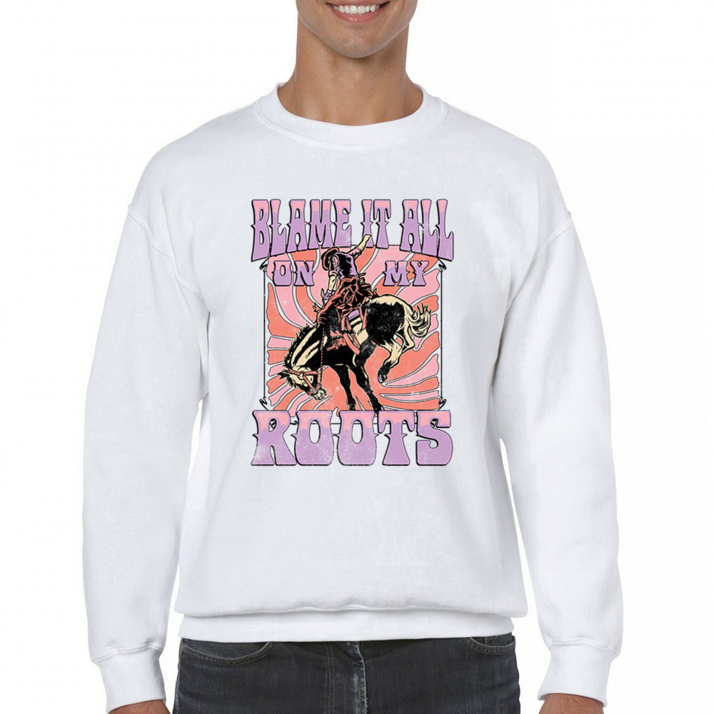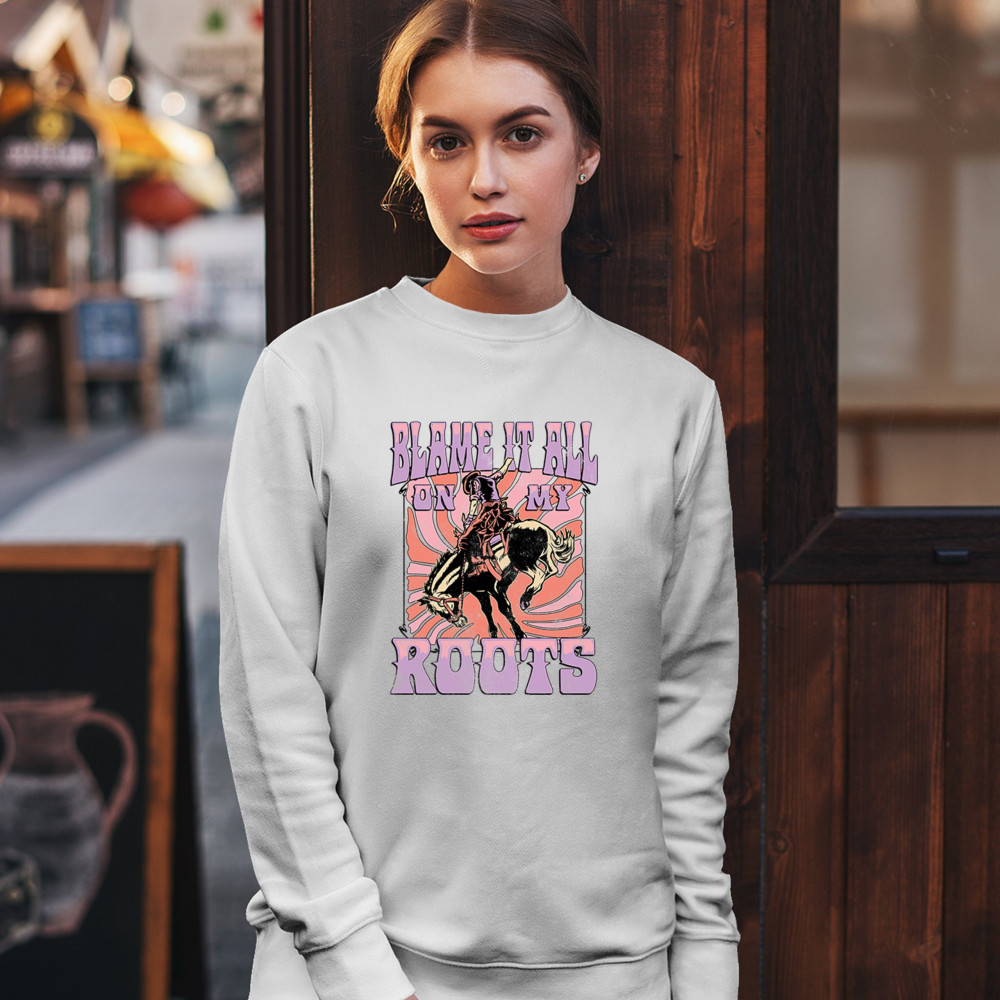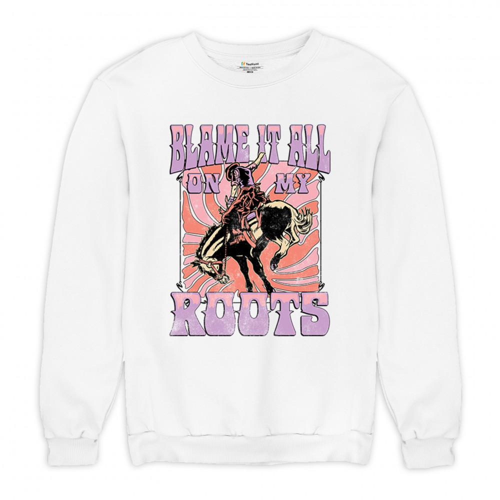 Blame It All On My Roots is vintage country style with rodeo spirit, perfect for small town life, barn dances, and wild country pride.