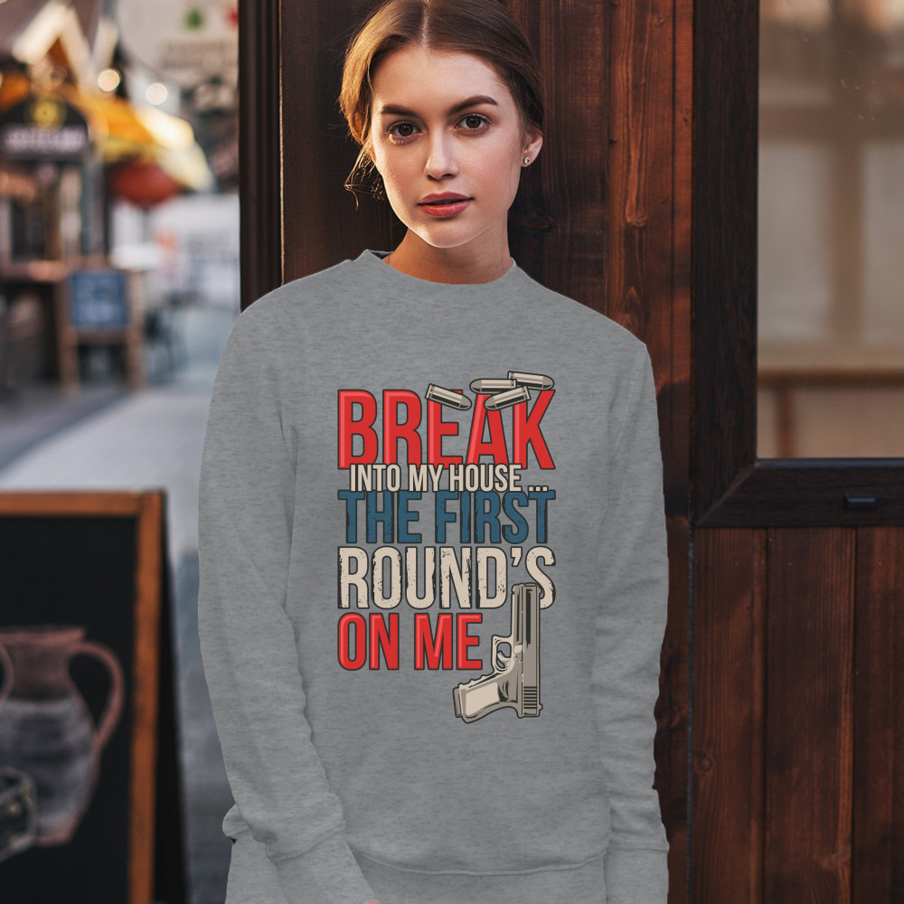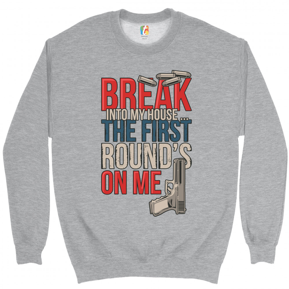 BREAK INTO MY HOUSE.. THE FIRST ROUND'S ON ME sweatshirt 2nd amendment crewneck gray