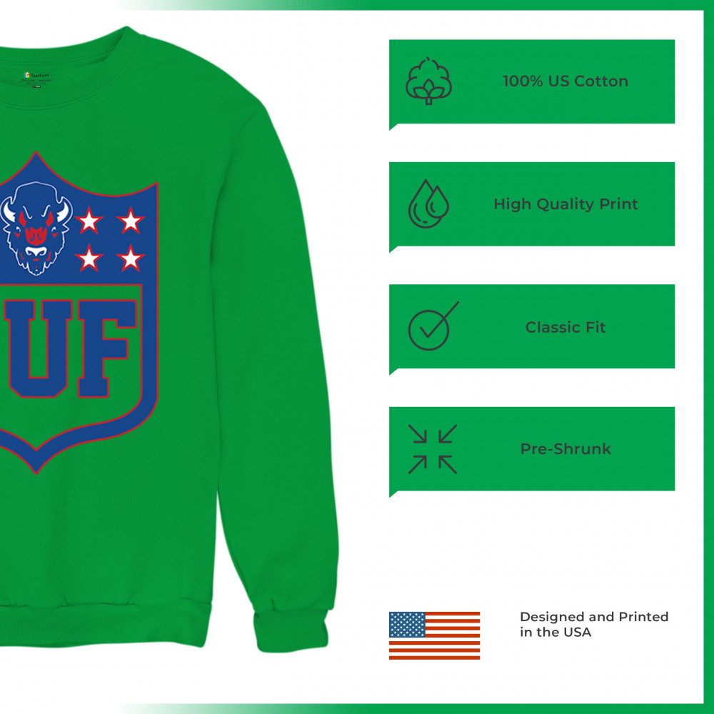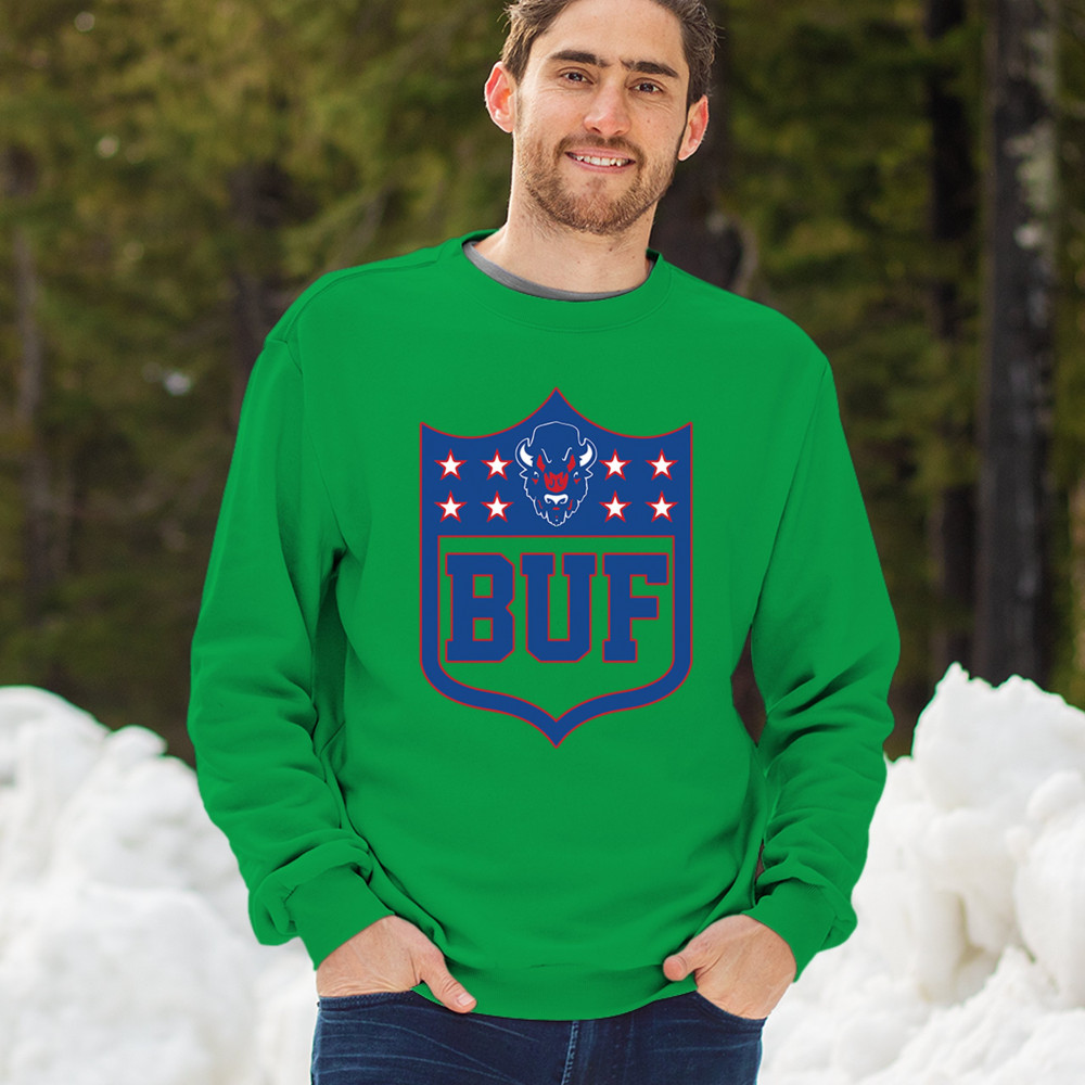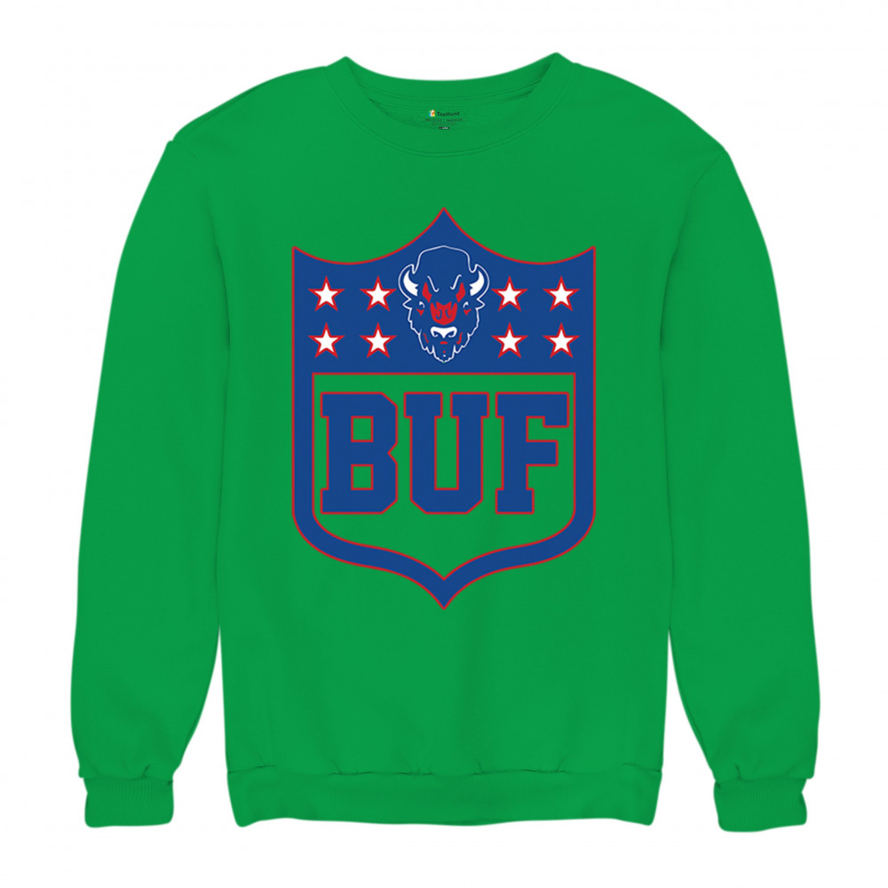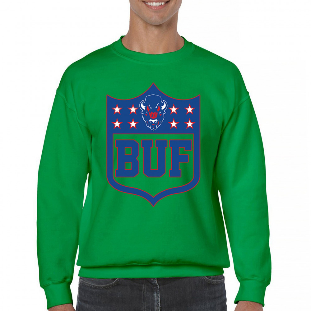 Bold Buffalo bison shield design for game day gear, tailgating, Sunday football, and championship pride in The Queen City.