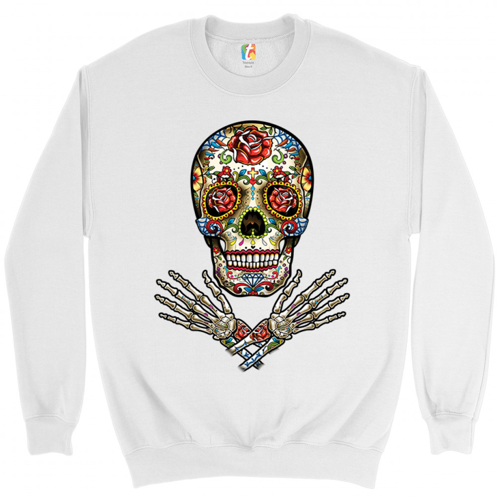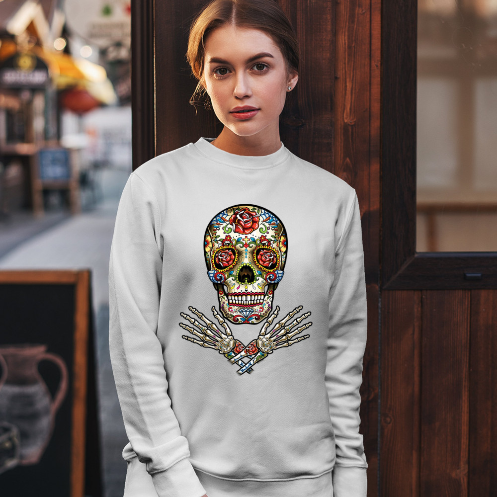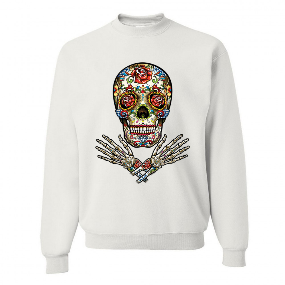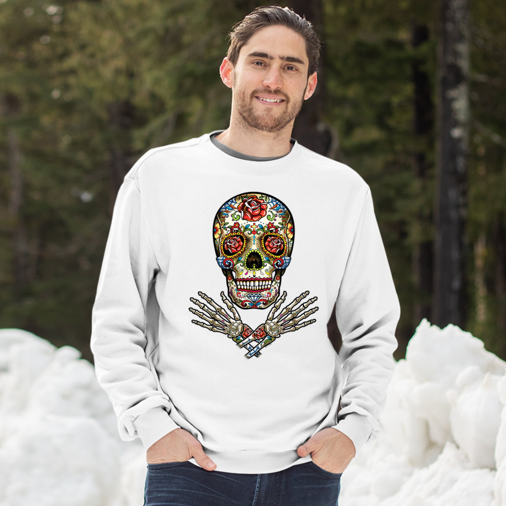 A huge print featuring a big calavera with roses in the eye sockets. There is a cross between the eyes and a huge rose on the forehead. Below the skull there are crossed arms. A great choice for anyone who upholds the traditions and celebrates the Day of
