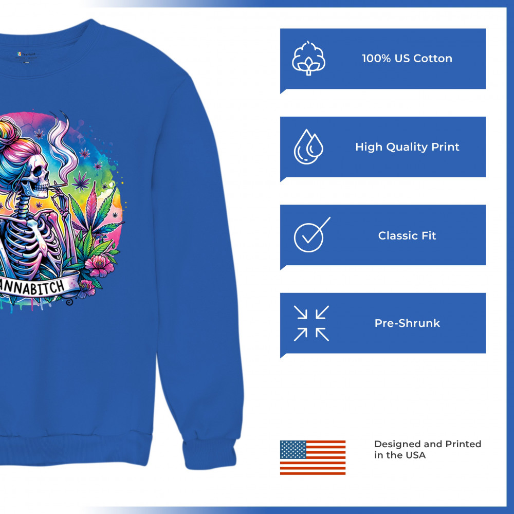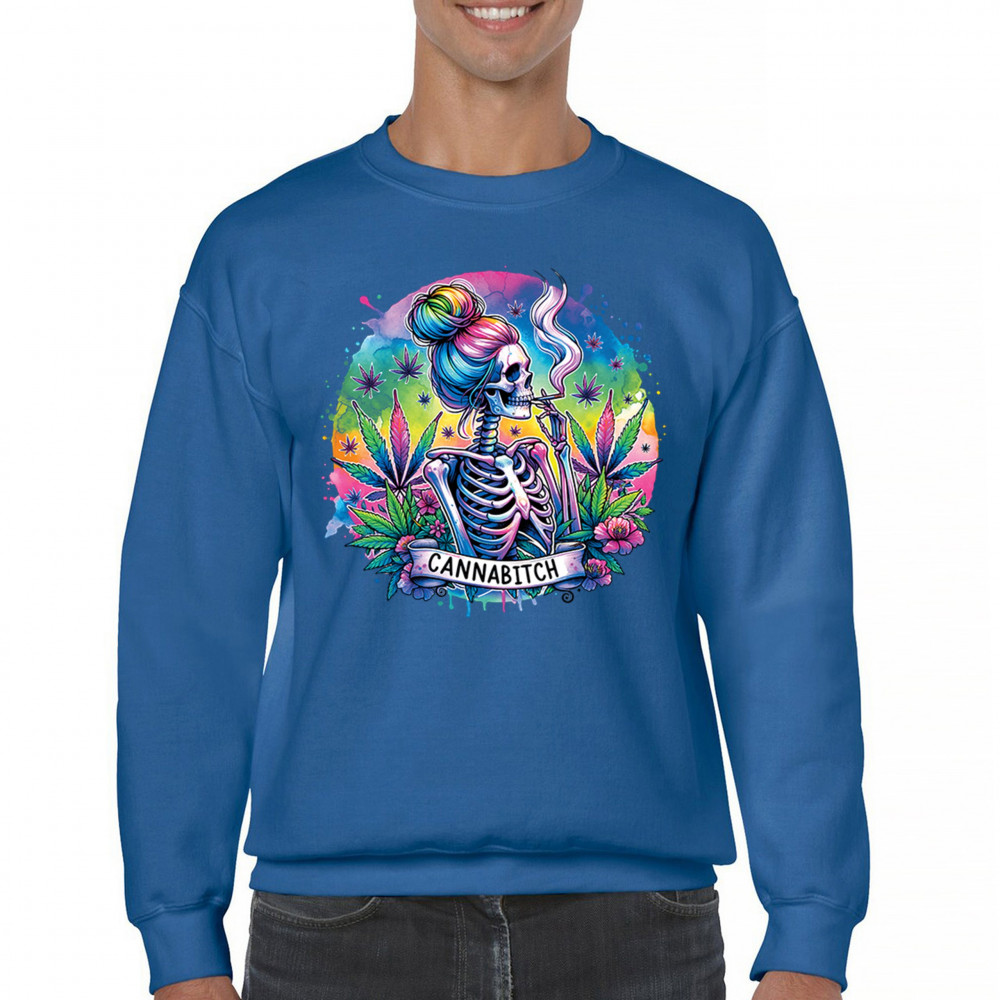 Unleash your inner weed queen with this CANNABITCH design—a psychedelic rainbow skeleton with major stoner girl energy. Dripping in neon colors, bold bud leaves, and fierce feminine vibes, it's a head-turning graphic for cannabis culture lovers, party girls, and unapologetically high women.