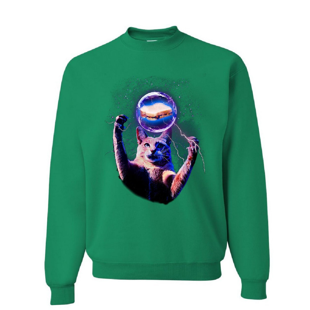 CAT CATCHING A PB&J cat catching a sandwich sweatshirt plasma ball kitty kitten weird sweater green