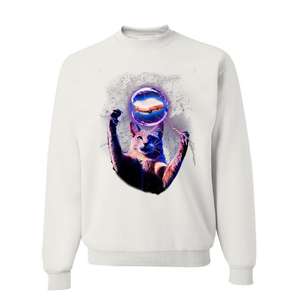 CAT CATCHING A PB&J cat catching a sandwich sweatshirt plasma ball kitty kitten weird sweater white