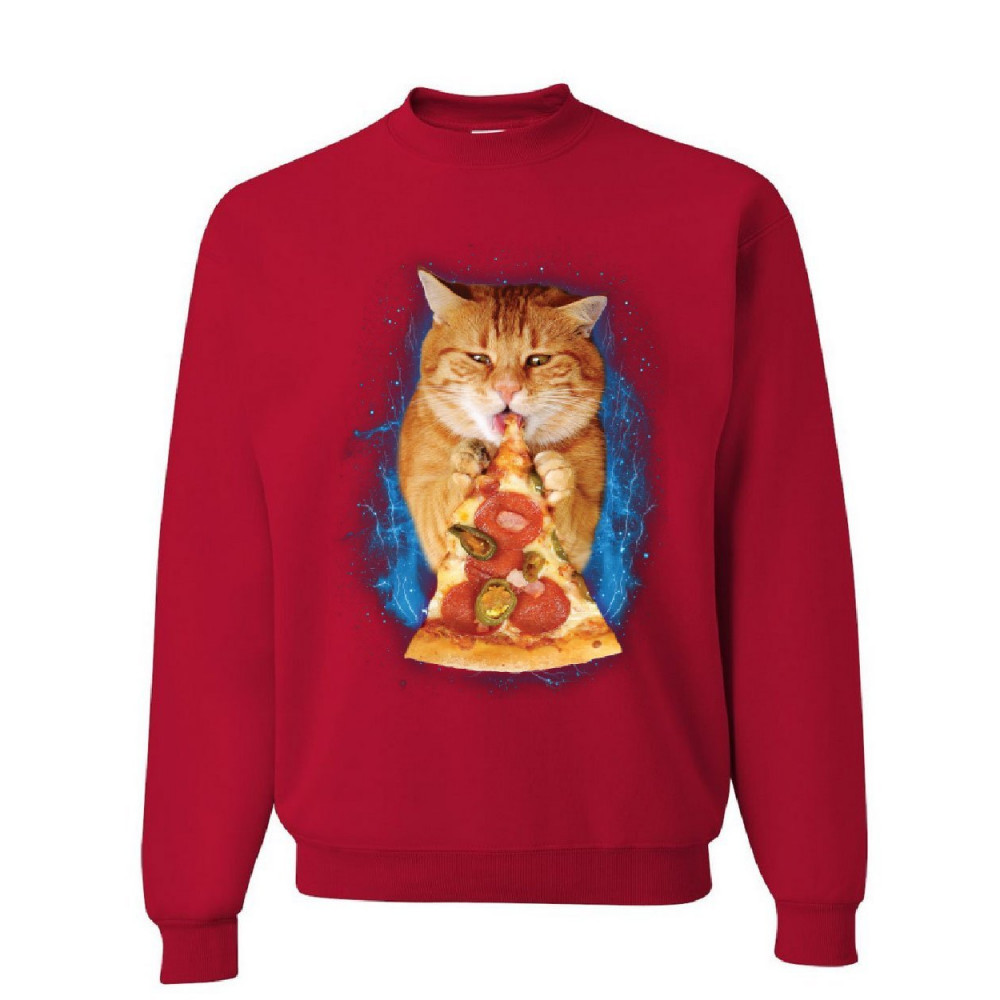CAT EATING PIZZA sweatshirt funny weird kitten pet kitty peperoni sweater red