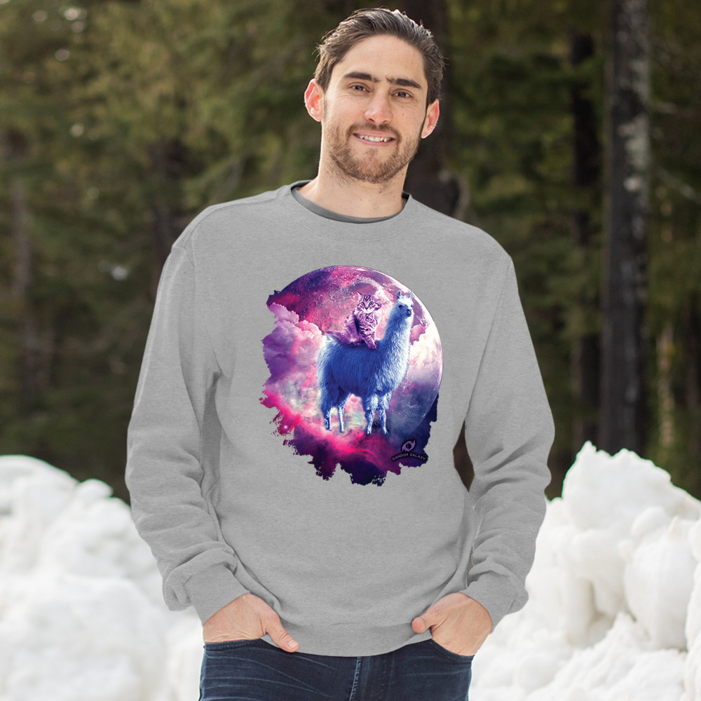CAT RIDING A LLAMA IN SPACE sweatshirt weird galaxy moon creative crewneck gray