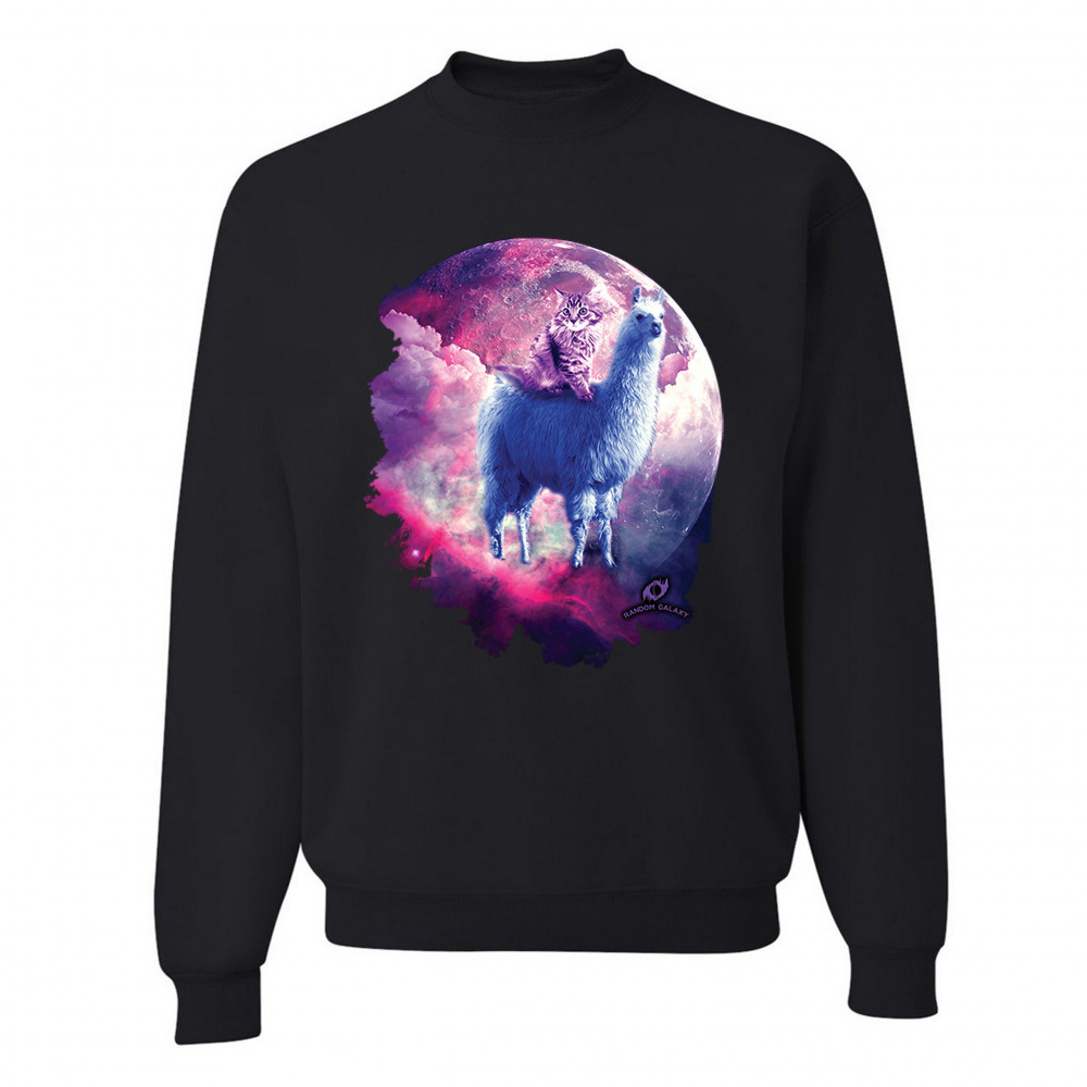 CAT RIDING A LLAMA IN SPACE sweatshirt weird galaxy moon creative crewneck black