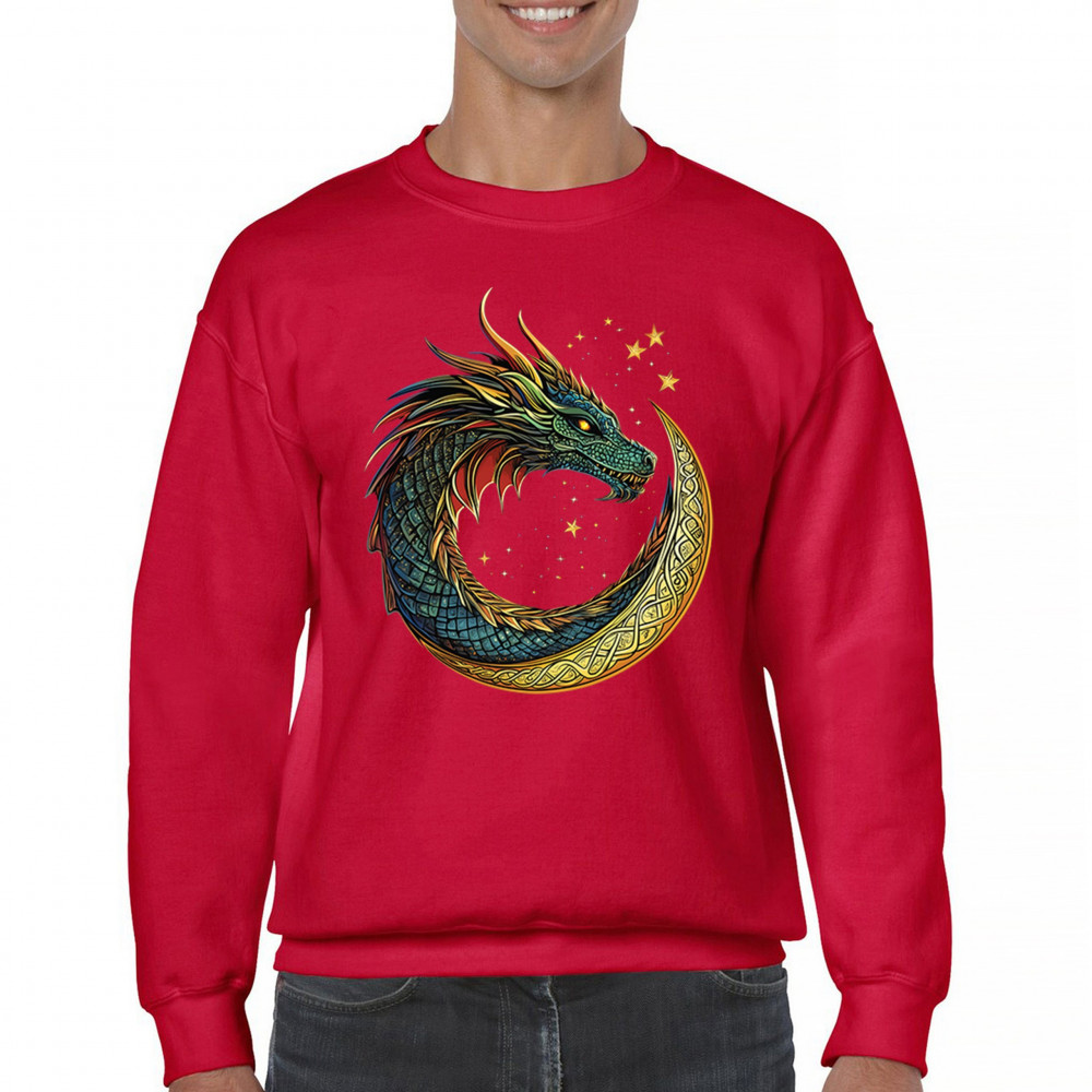 Fierce dragon in Celtic crescent moon with glowing eyes and starry sky. Perfect for fantasy fans, gamers, and spiritual warriors seeking mythic art.