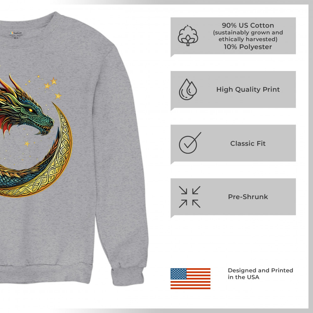 Fierce dragon in Celtic crescent moon with glowing eyes and starry sky. Perfect for fantasy fans, gamers, and spiritual warriors seeking mythic art.