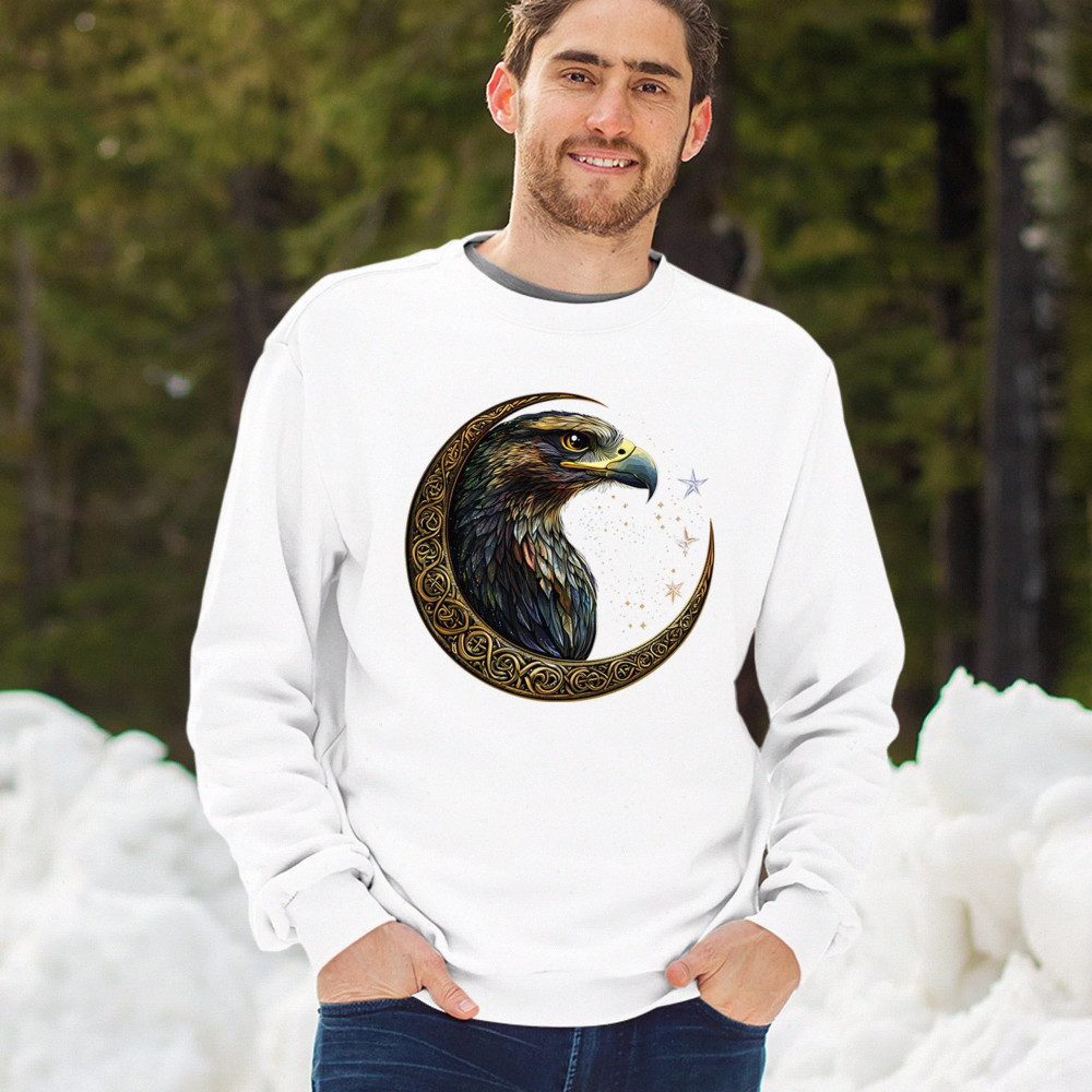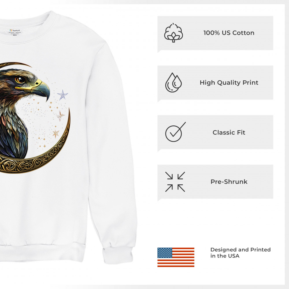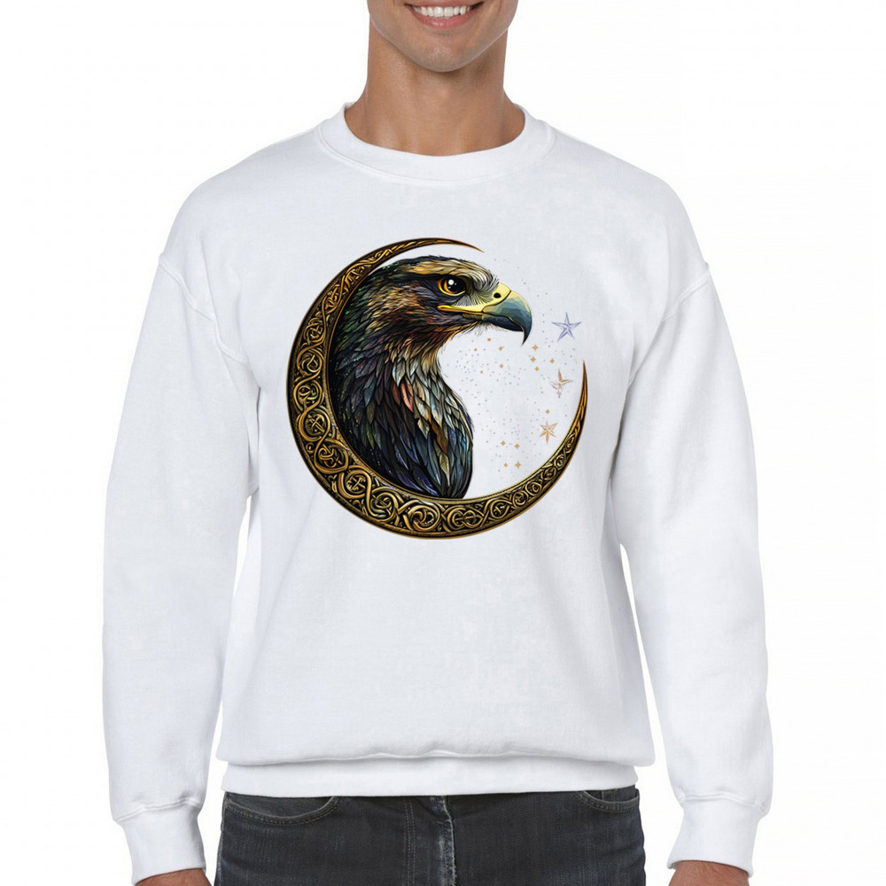 A beautifully detailed eagle with vibrant feathers is framed by a golden Celtic crescent moon and surrounded by a starry cosmic sky. This striking design represents freedom, spiritual power, and the mystery of the skies. Perfect for patriots, bird lovers, and those who connect with nature, tribal symbolism, and celestial art.