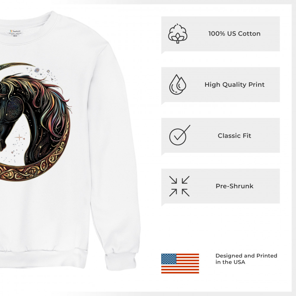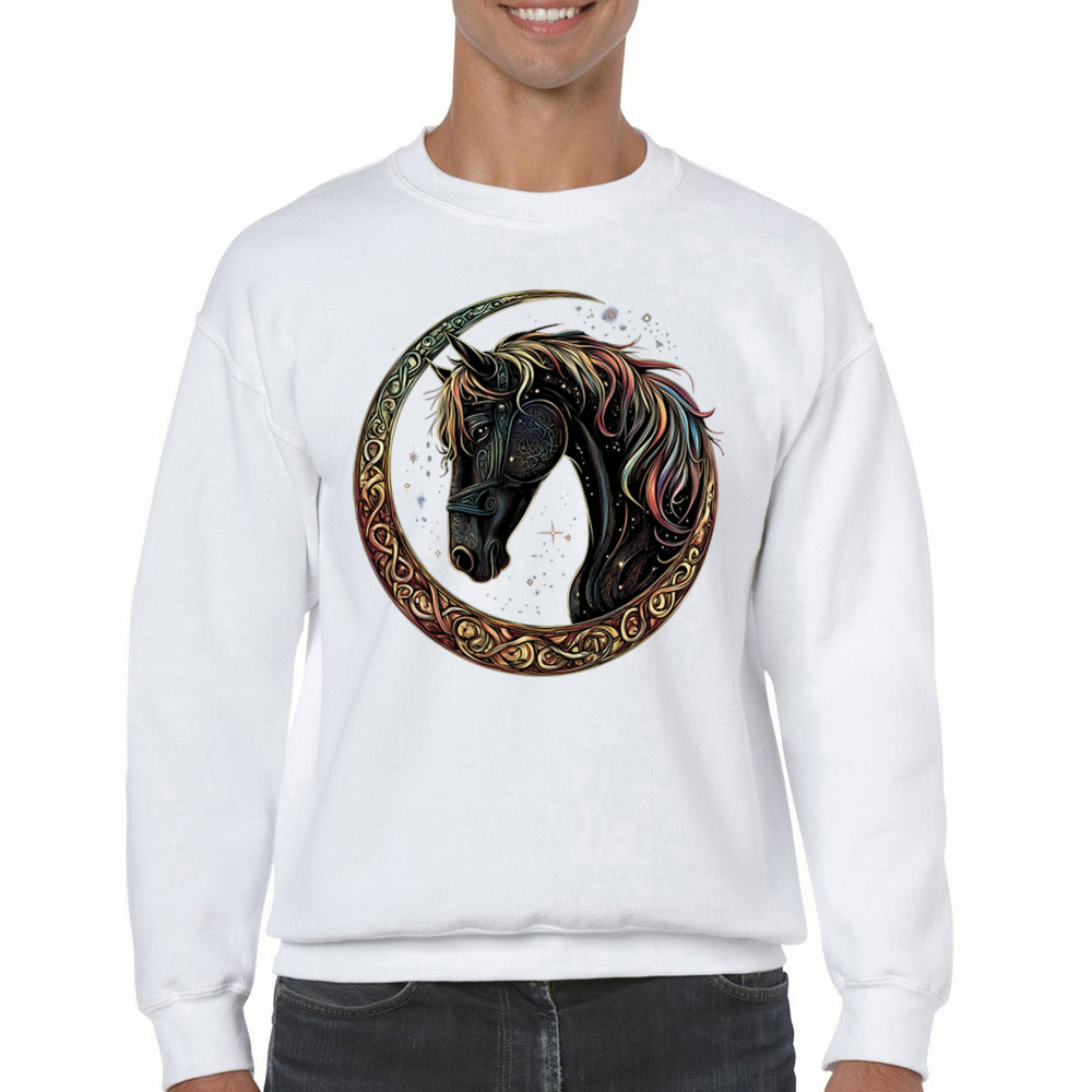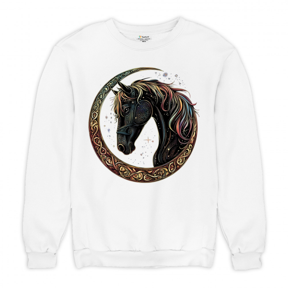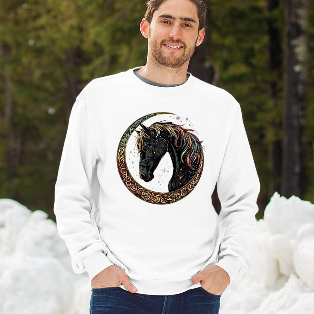 Celebrate the power and grace of the cosmos with this majestic black horse framed by a golden Celtic crescent moon. Its rainbow mane and celestial body symbolize strength, movement, mystery, and spiritual magic. A stunning piece for fantasy fans, equestrians, and dreamers who love horses and stars.