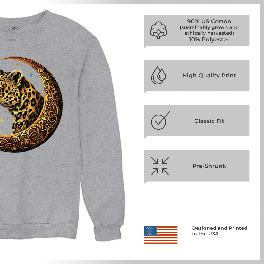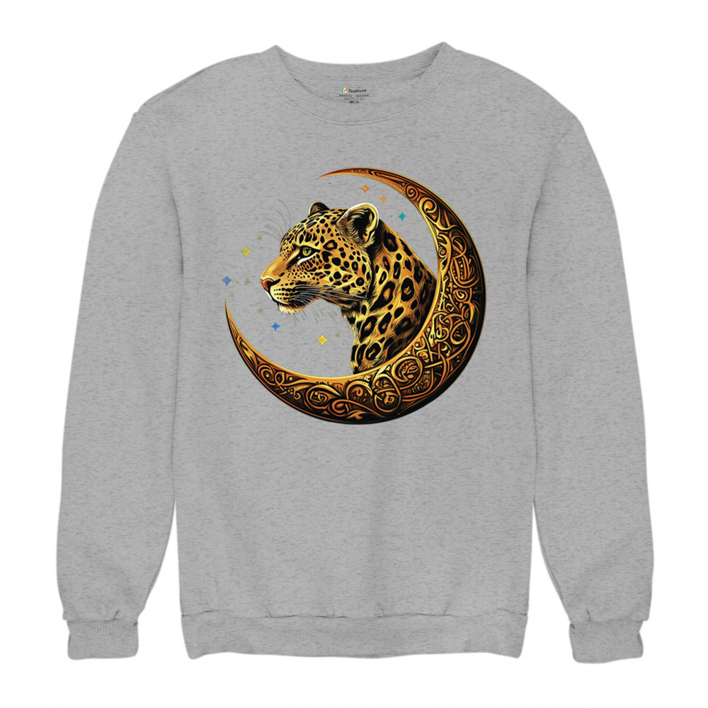 Unleash wild energy and spiritual symbolism with this bold leopard design set inside a golden Celtic crescent moon. A cosmic starry background amplifies its mystical vibe, symbolizing agility, independence, and awareness. Perfect for big cat lovers, jungle animal fans, and seekers of fantasy or tribal-inspired art.