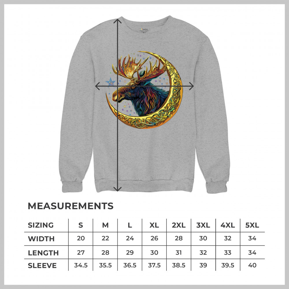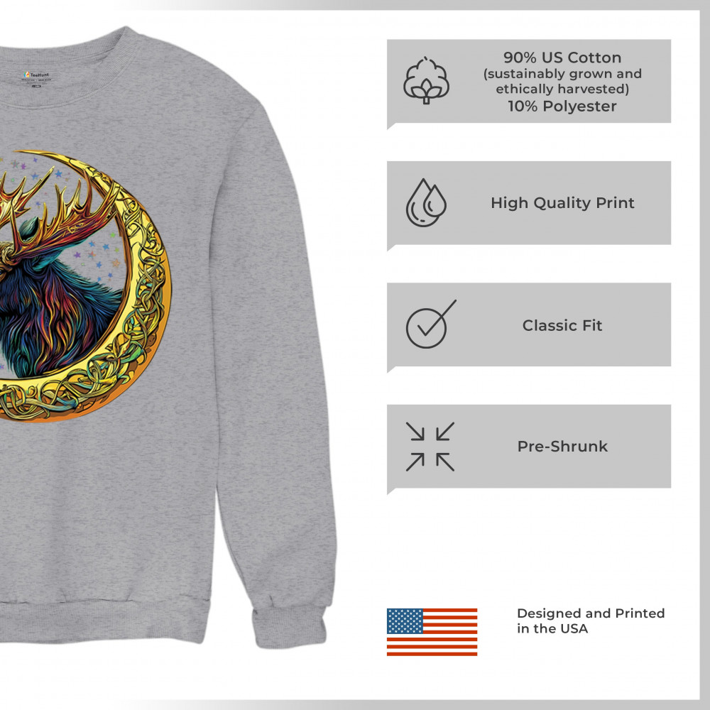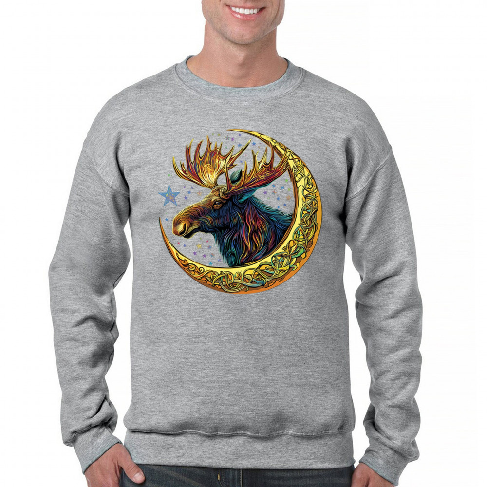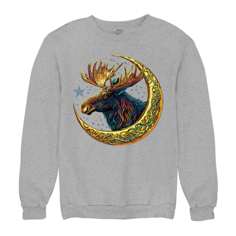 Mystical moose in gold Celtic crescent moon design—symbolizes strength, nature wisdom, and cosmic spirit for fantasy lovers and woodland fans.