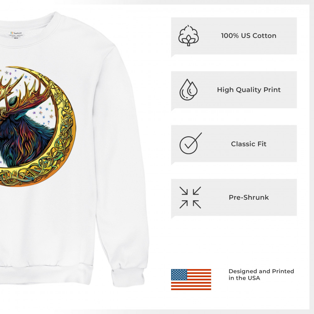 This vibrant moose design blends tribal art and fantasy energy with a golden Celtic crescent moon. Cosmic fur, radiant antlers, and a star-speckled sky make this image a symbol of strength, natural wisdom, and mysticism. Ideal for druids, hunters, fantasy fans, or spirit animal seekers connected to the forest and celestial realm.