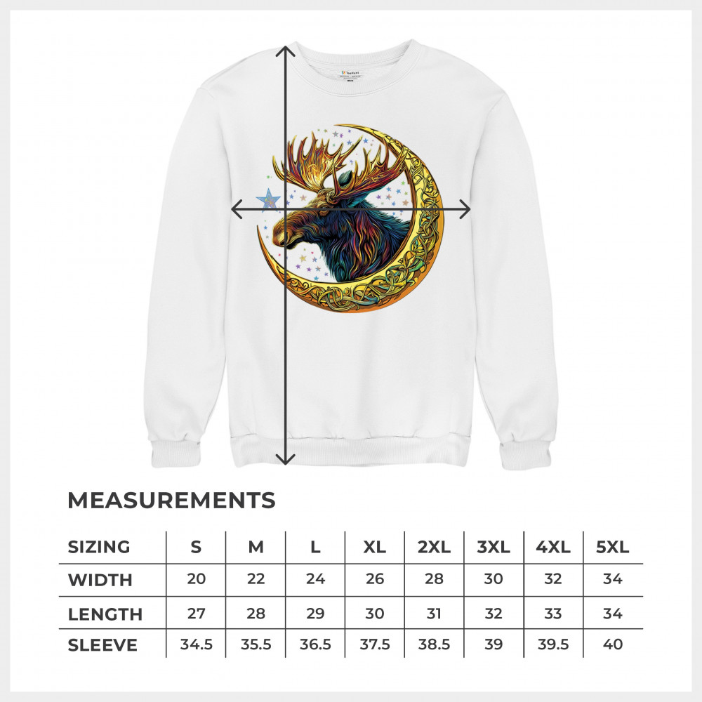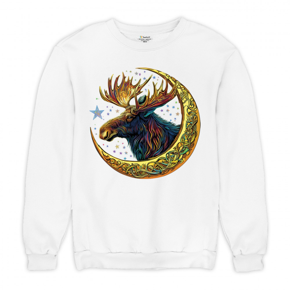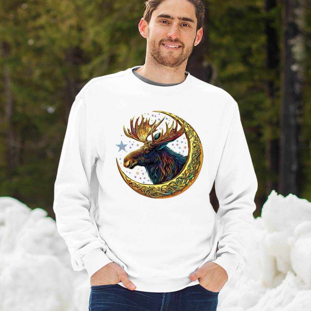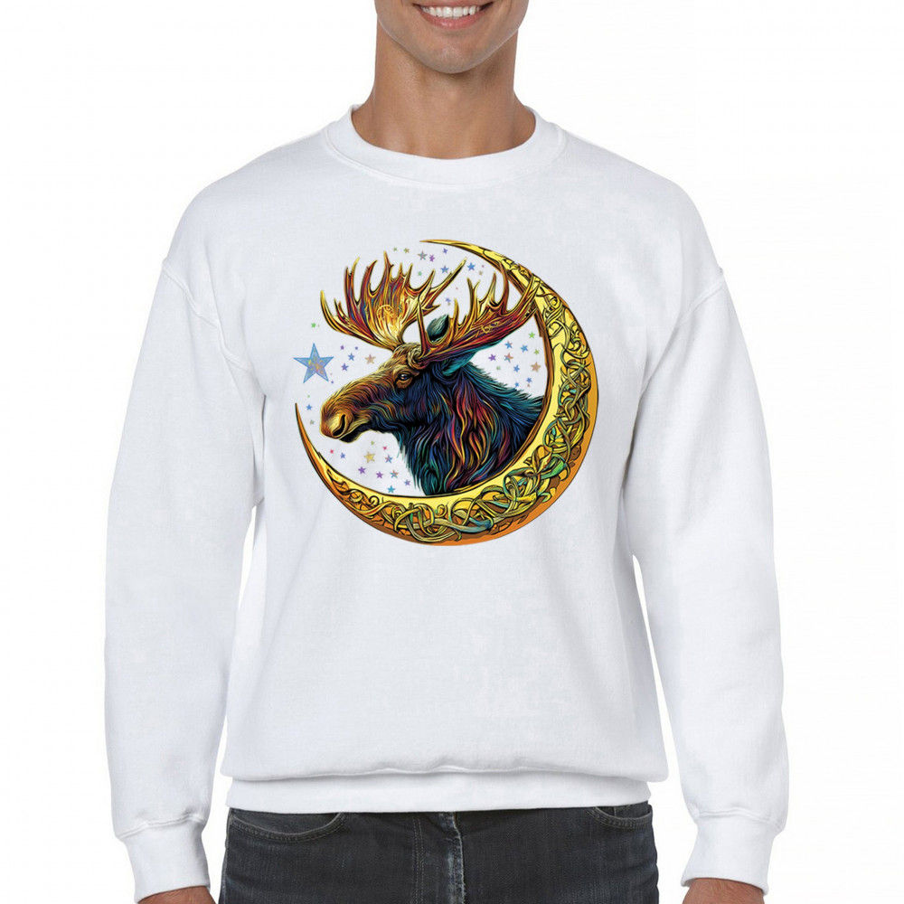 Mystical moose in gold Celtic crescent moon design—symbolizes strength, nature wisdom, and cosmic spirit for fantasy lovers and woodland fans.