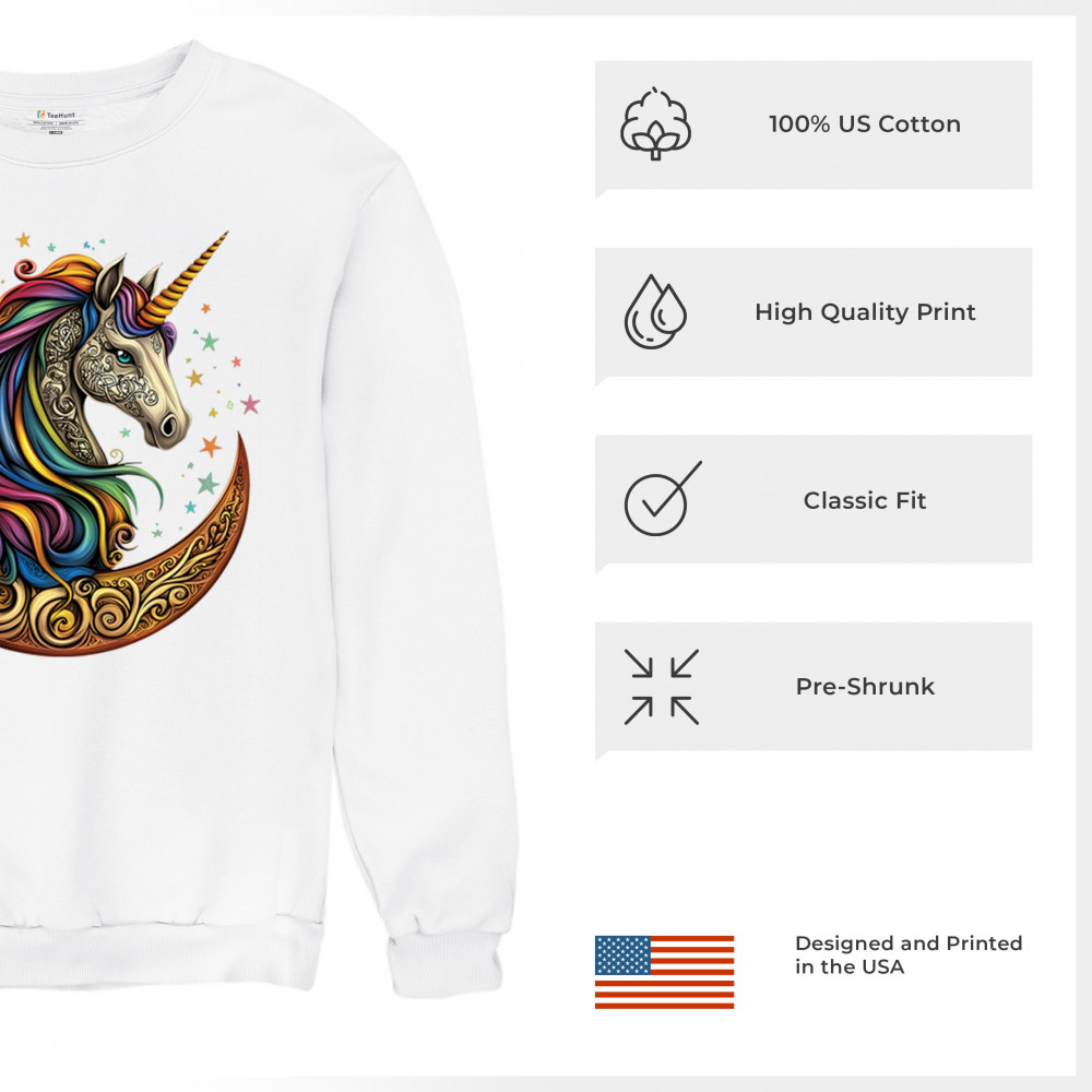 Rainbow-maned unicorn in golden Celtic moon design—perfect for fantasy lovers, dreamers, and unicorn fans who believe in magic and spirit.