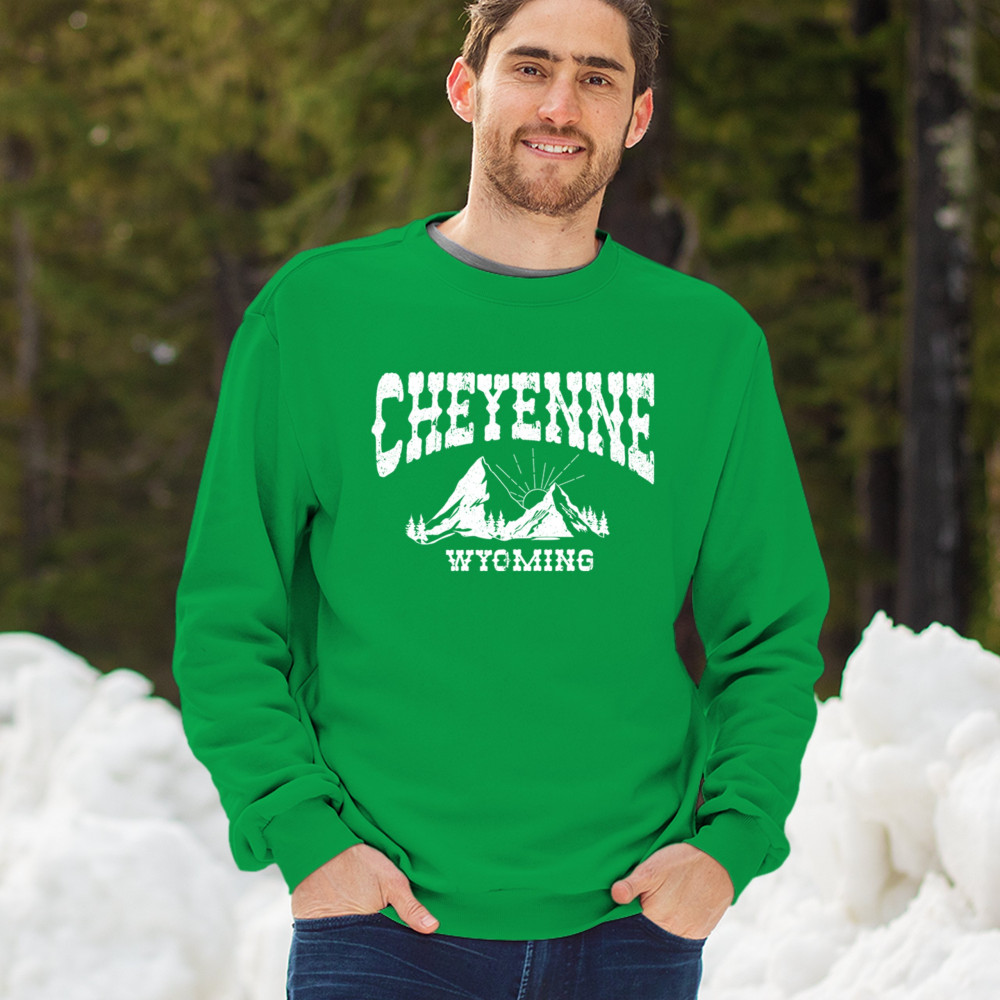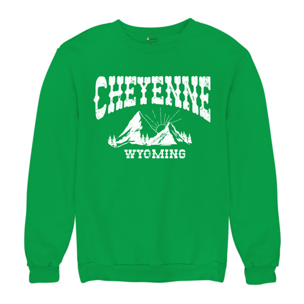 Vintage Cheyenne Wyoming design with mountain sunrise for outdoor lovers and locals. Perfect for travel, hiking, or Western pride.