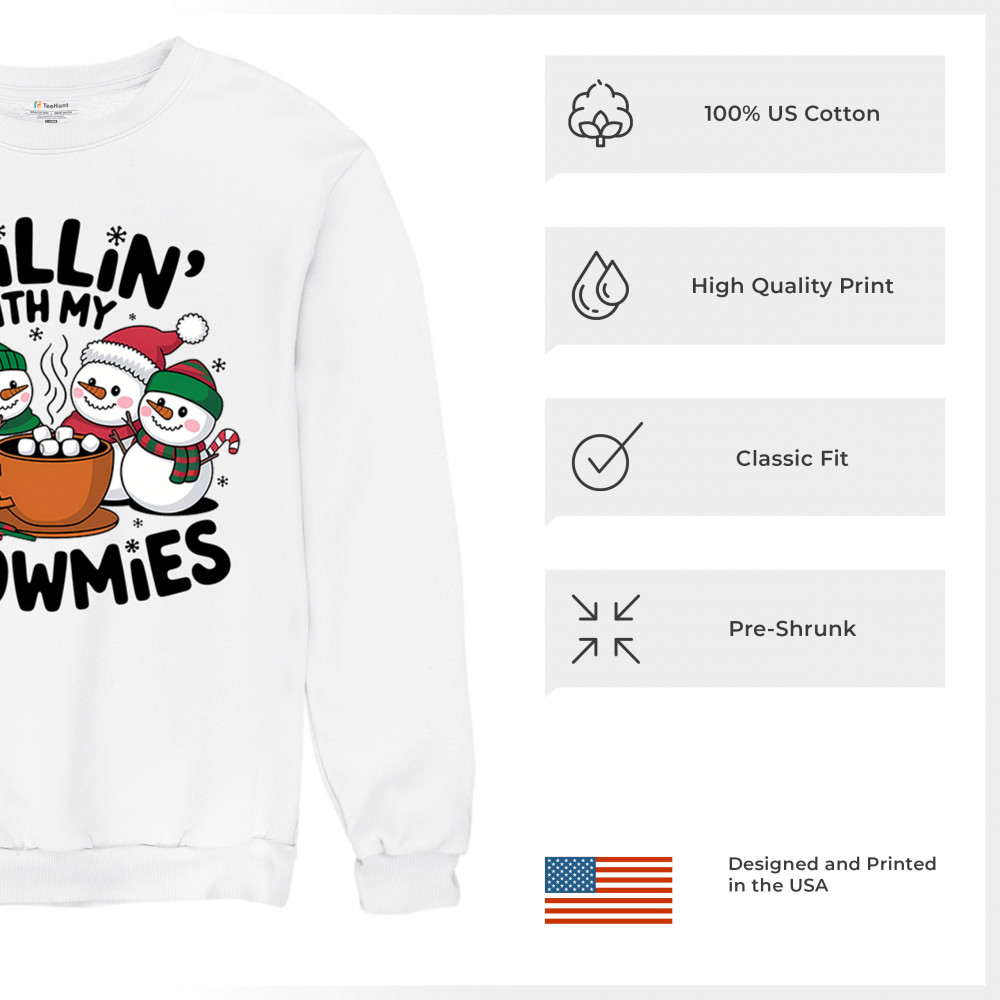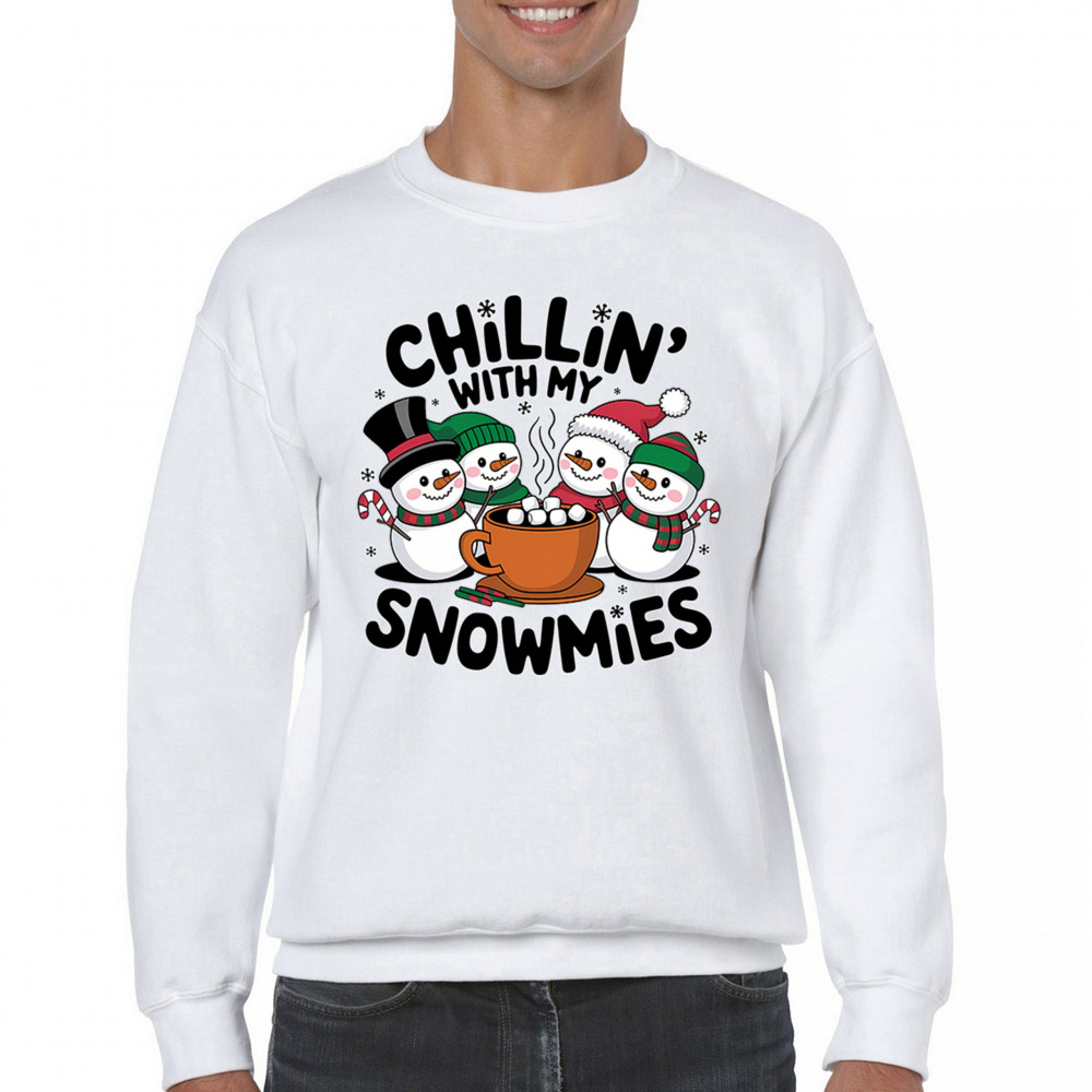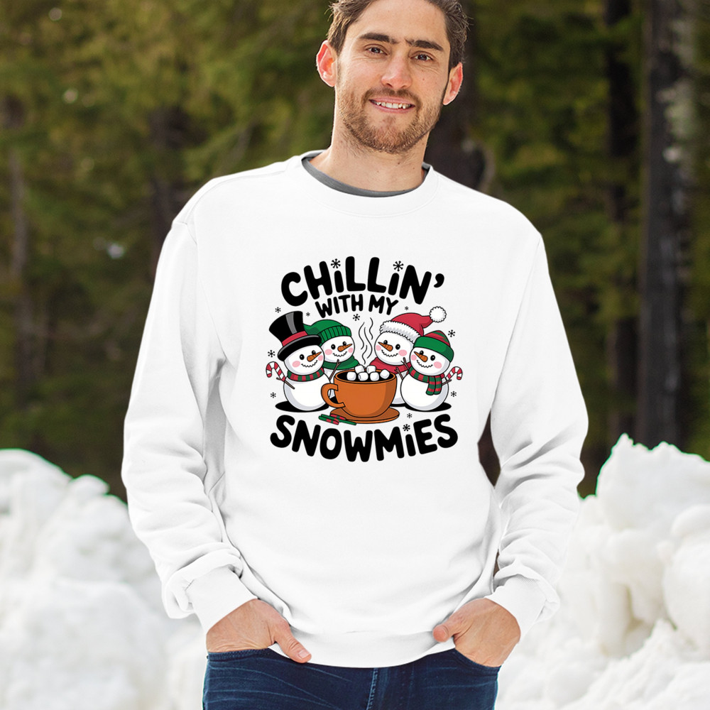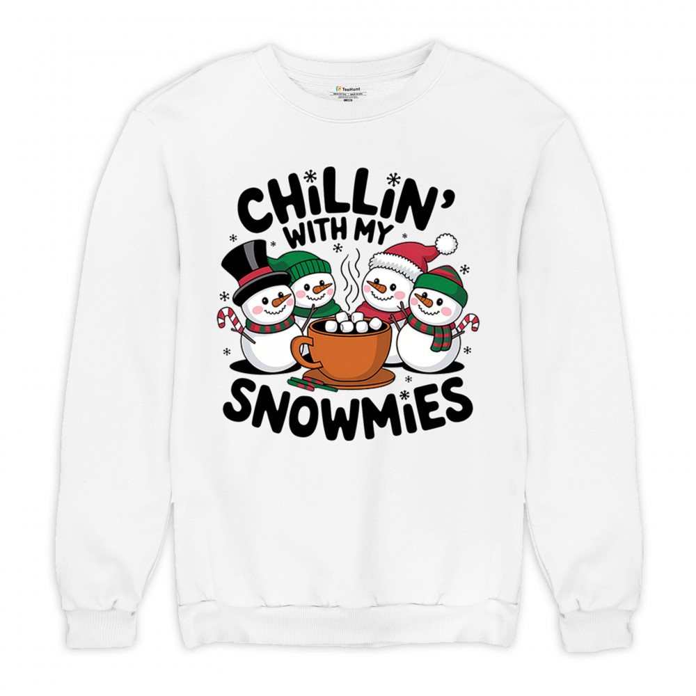A cute and cheerful winter design showing happy snowmen sharing hot cocoa, perfect for Christmas gatherings, holiday events, seasonal photos, white-elephant gifting, festive family nights, winter celebrations, cozy weekend vibes, and fans of playful holiday humor. A fun graphic for anyone who loves bright and friendly Christmas styles.