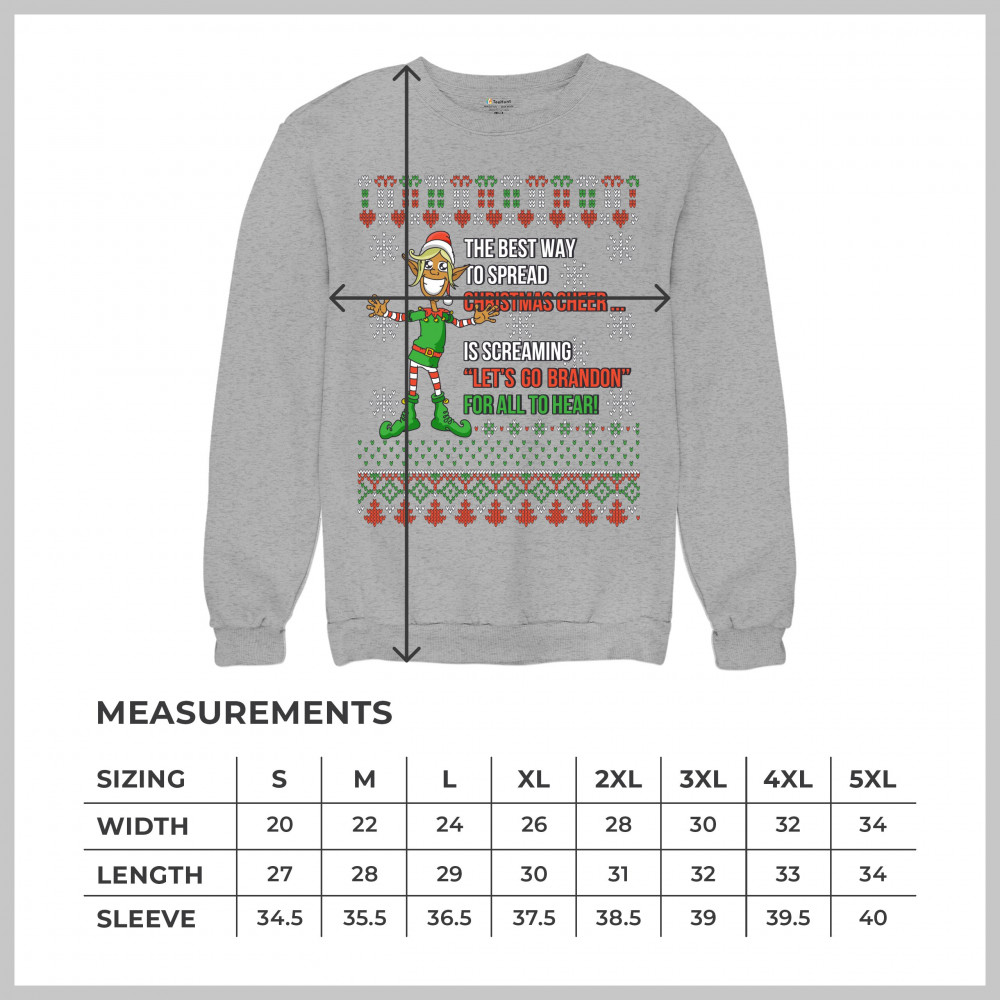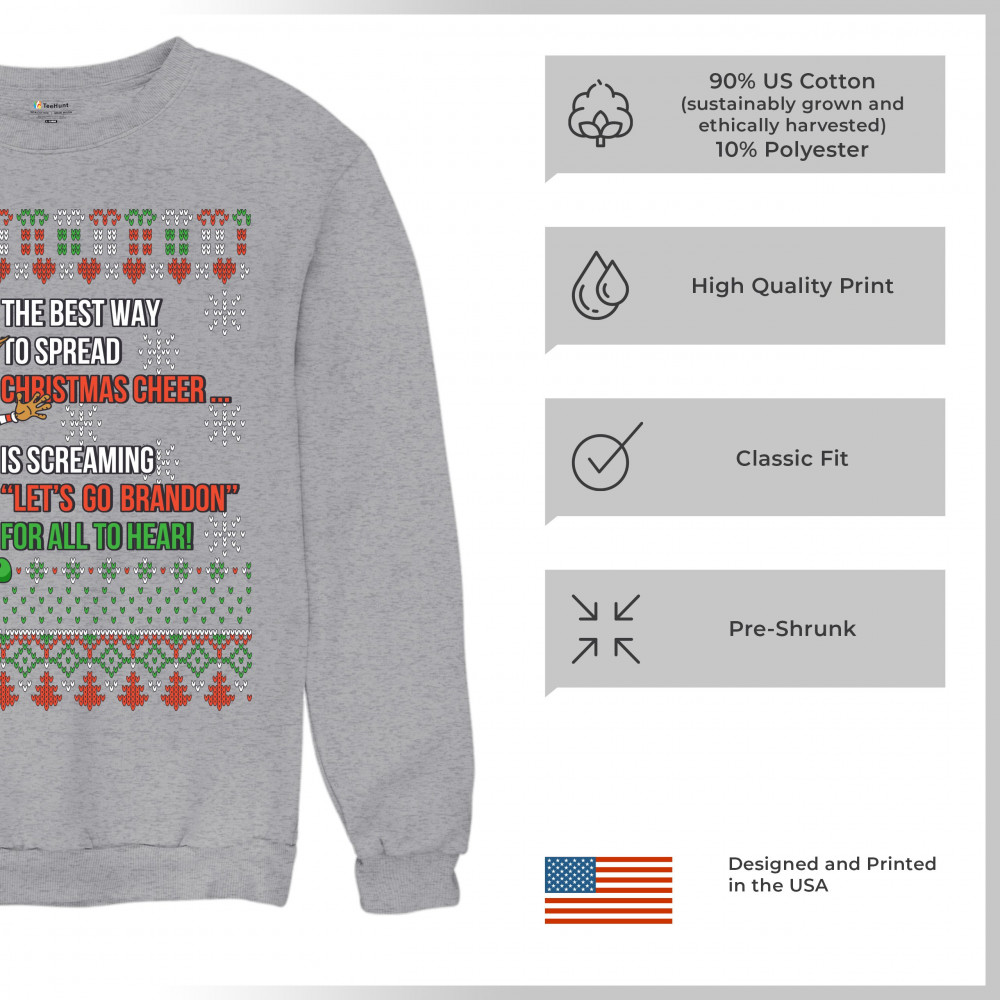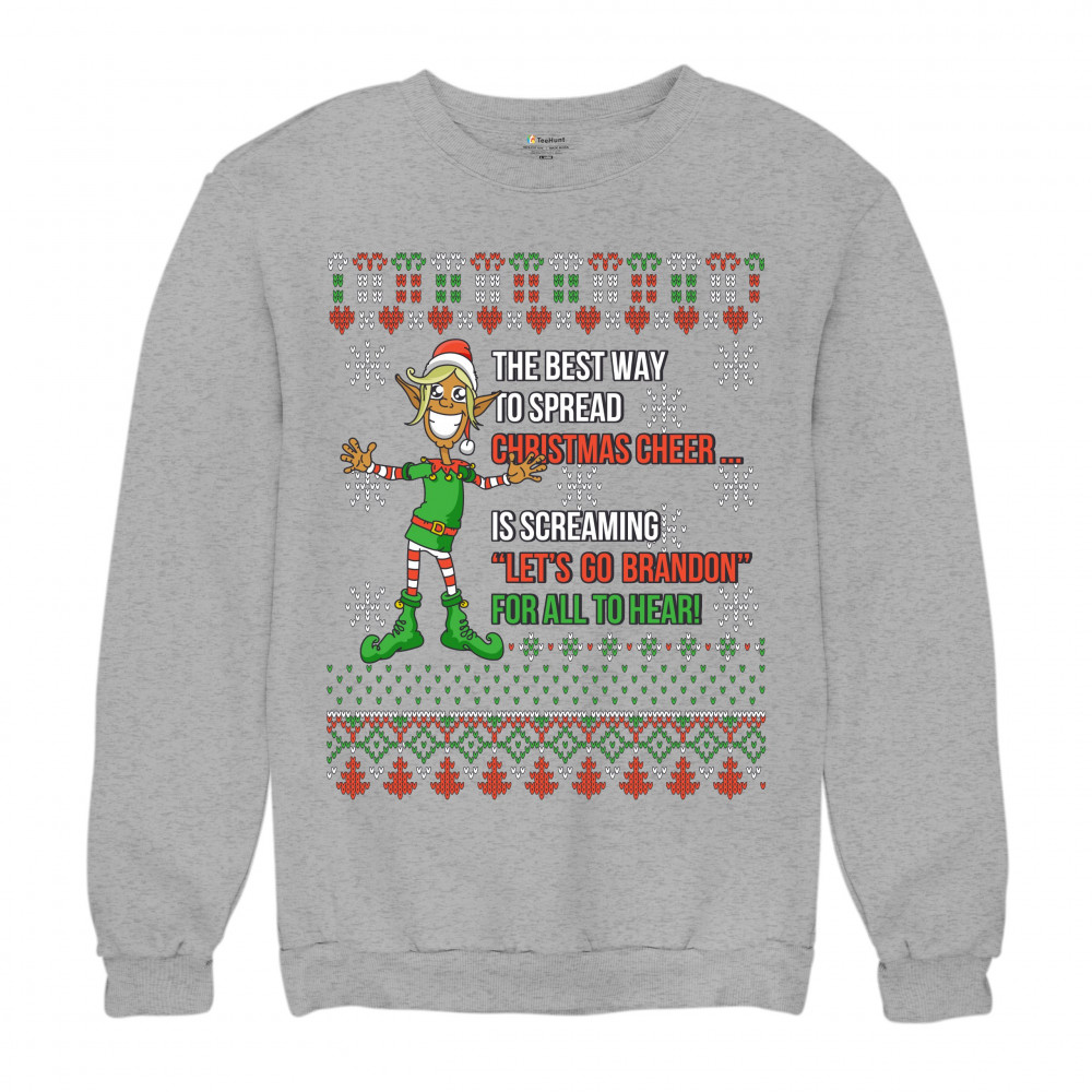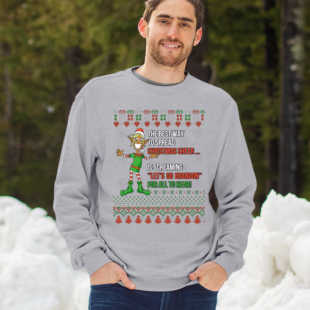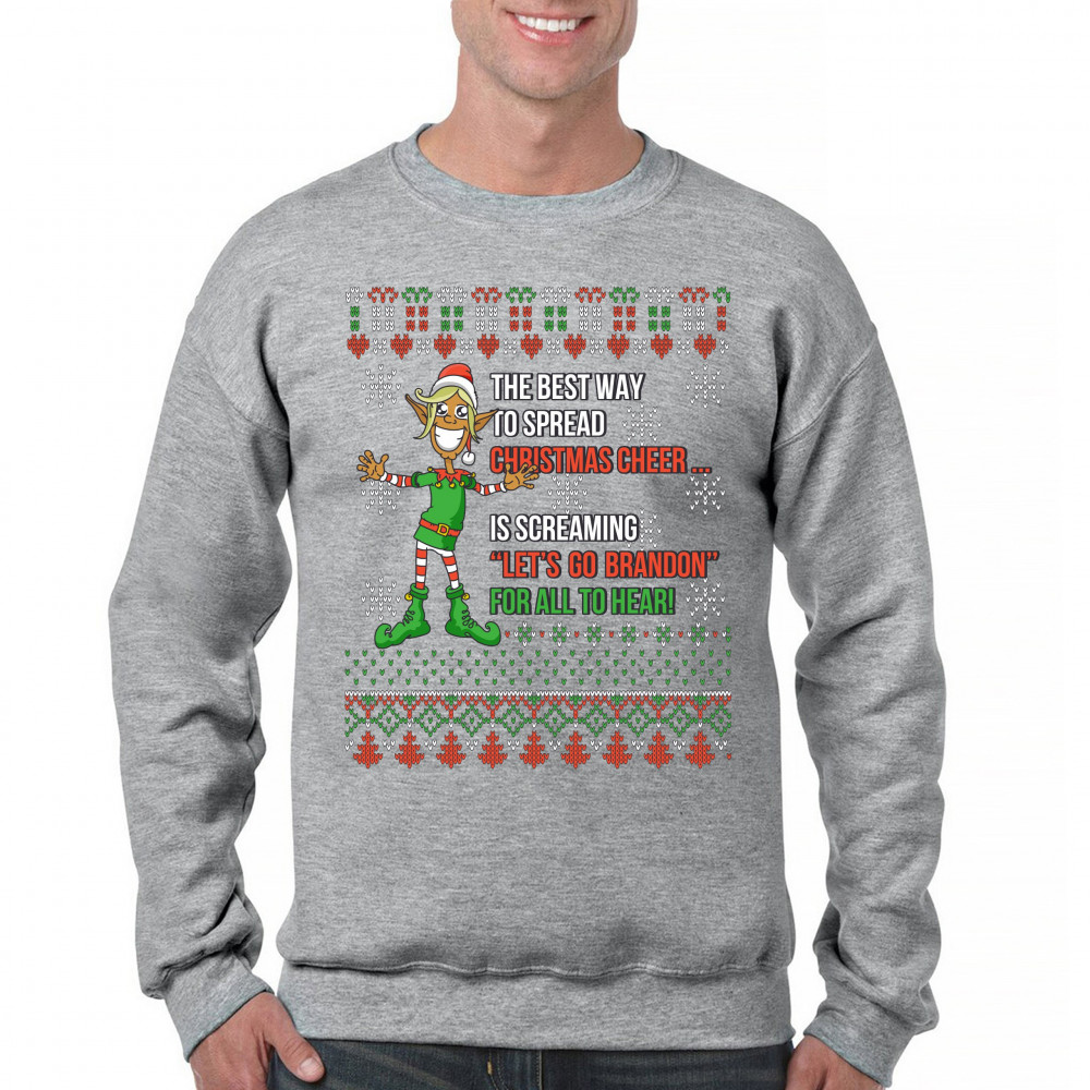 A funny print saying: "The Best Way to Spread Christmas Cheer Is Screaming Let's Go Brandon for All to Hear" and featuring a smiling elf. The print is decorated as a Christmas ugly Sweater. A great choice to wear for a Christmas or New Year's Eve party an