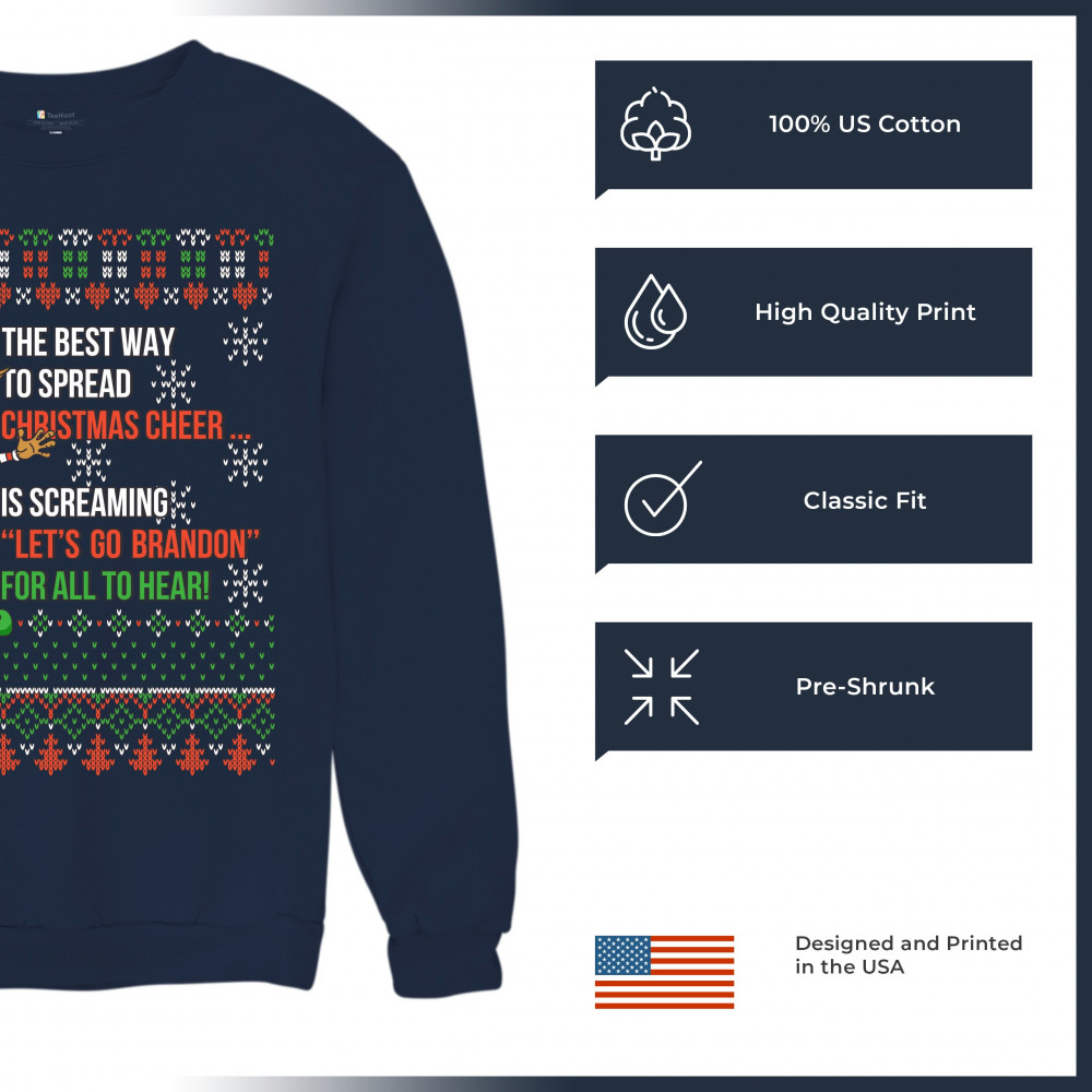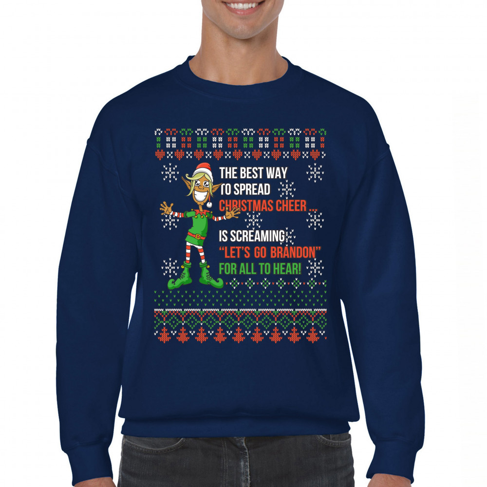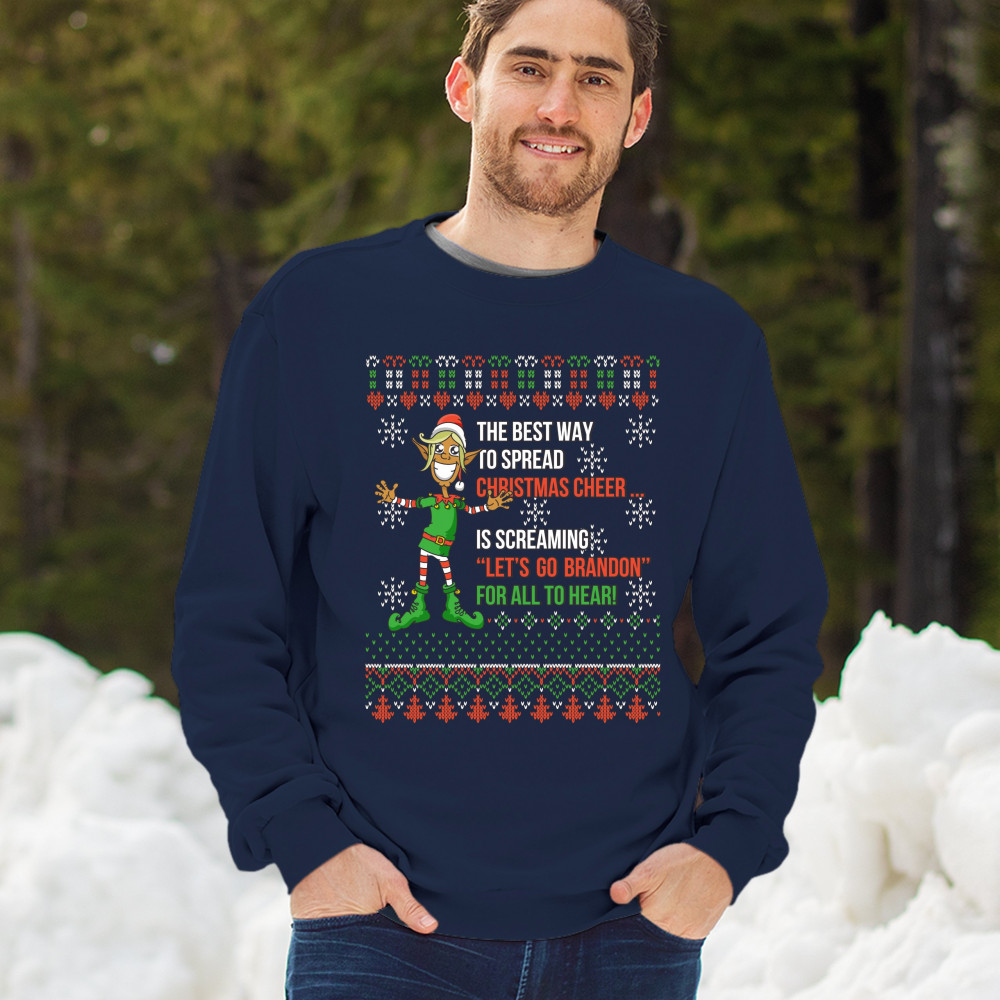 A funny print saying: "The Best Way to Spread Christmas Cheer Is Screaming Let's Go Brandon for All to Hear" and featuring a smiling elf. The print is decorated as a Christmas ugly Sweater. A great choice to wear for a Christmas or New Year's Eve party an