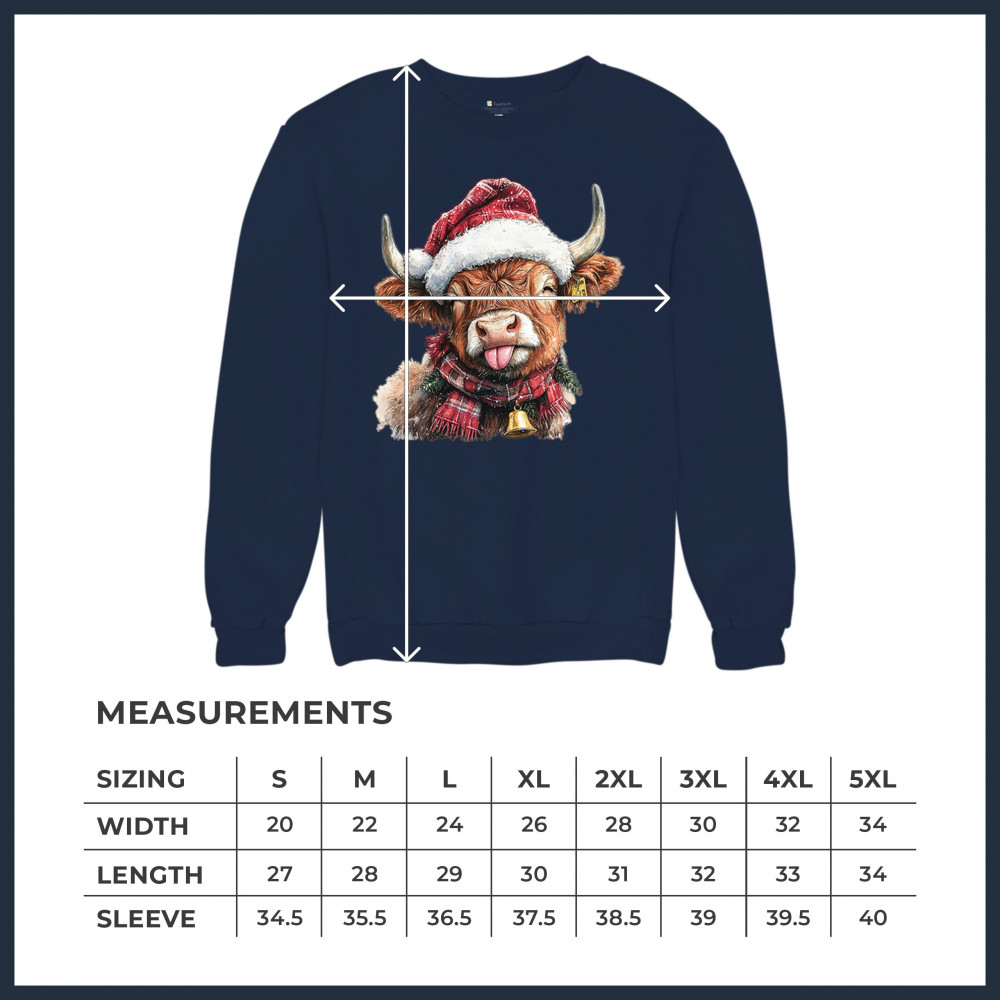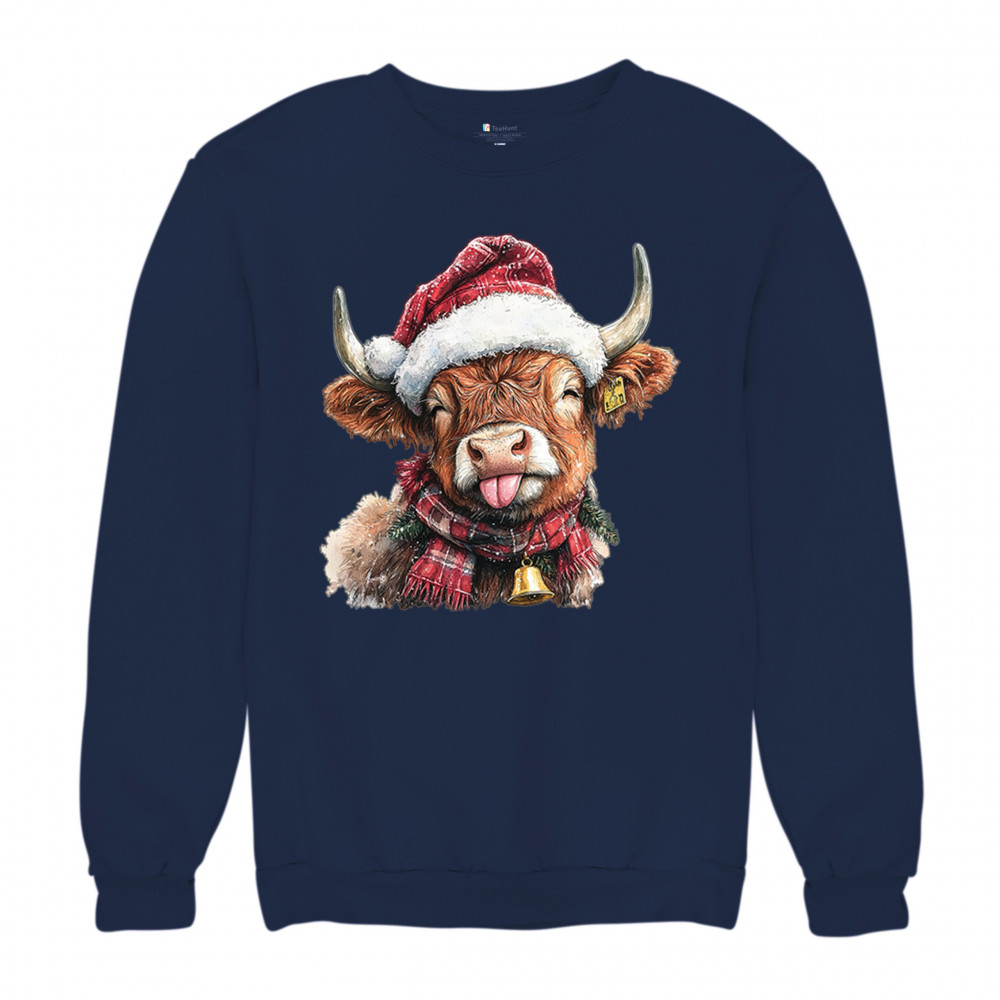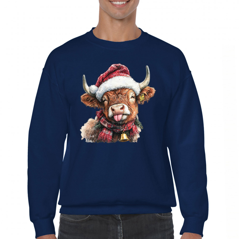 CHRISTMAS HIGHLAND COW crewneck sweatshirt merry xmas tree cute farm bells navy blue