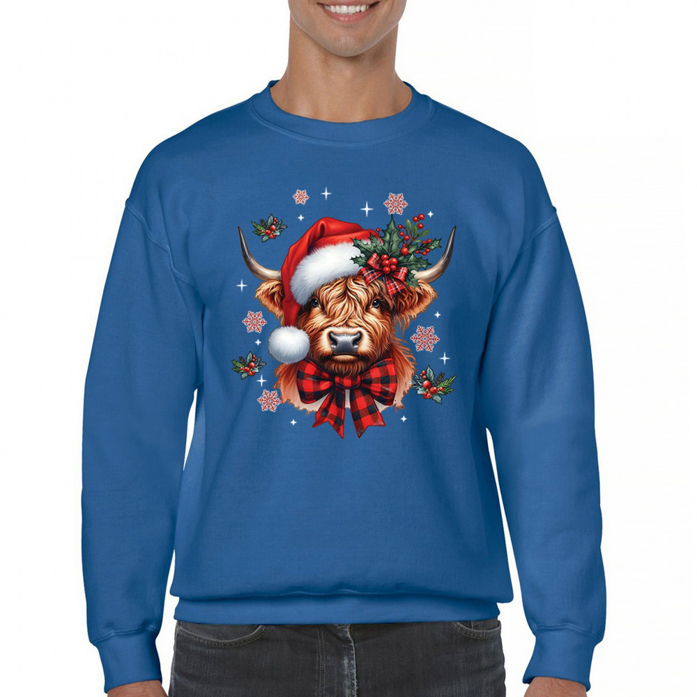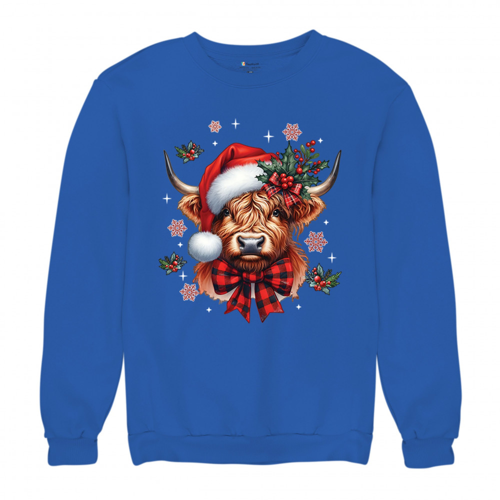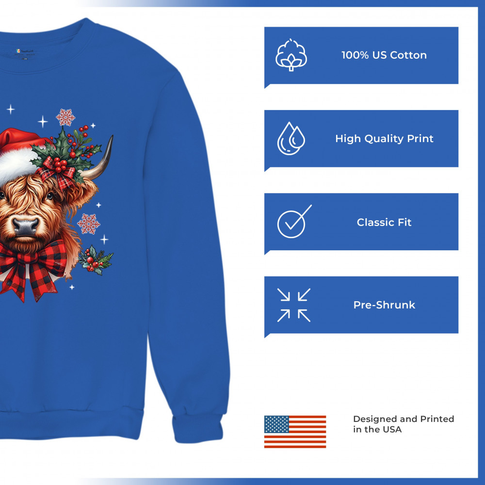 Festive Highland cow Christmas design with Santa hat, plaid bow, holly, and rustic farmhouse holiday charm. Perfect for cozy winter decor.