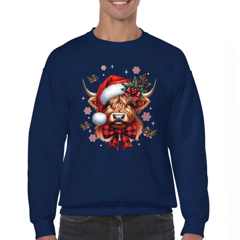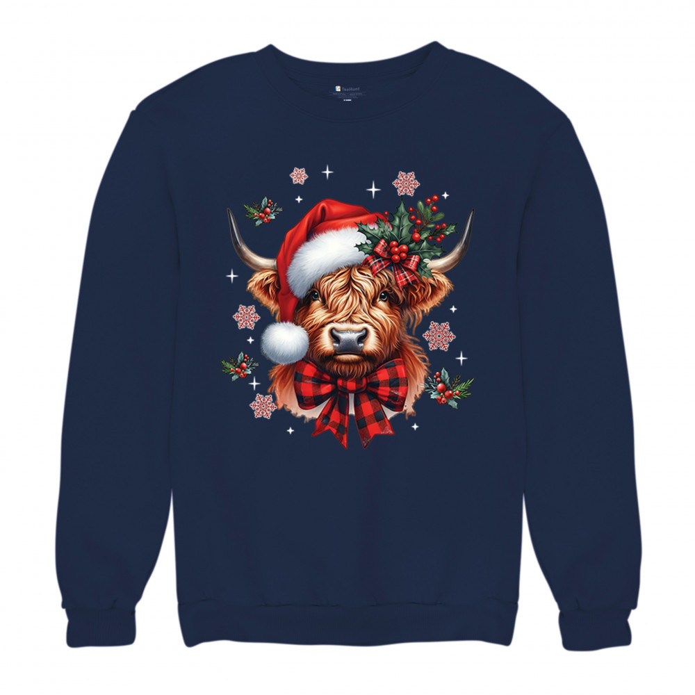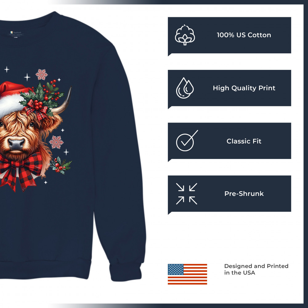 Festive Highland cow Christmas design with Santa hat, plaid bow, holly, and rustic farmhouse holiday charm. Perfect for cozy winter decor.