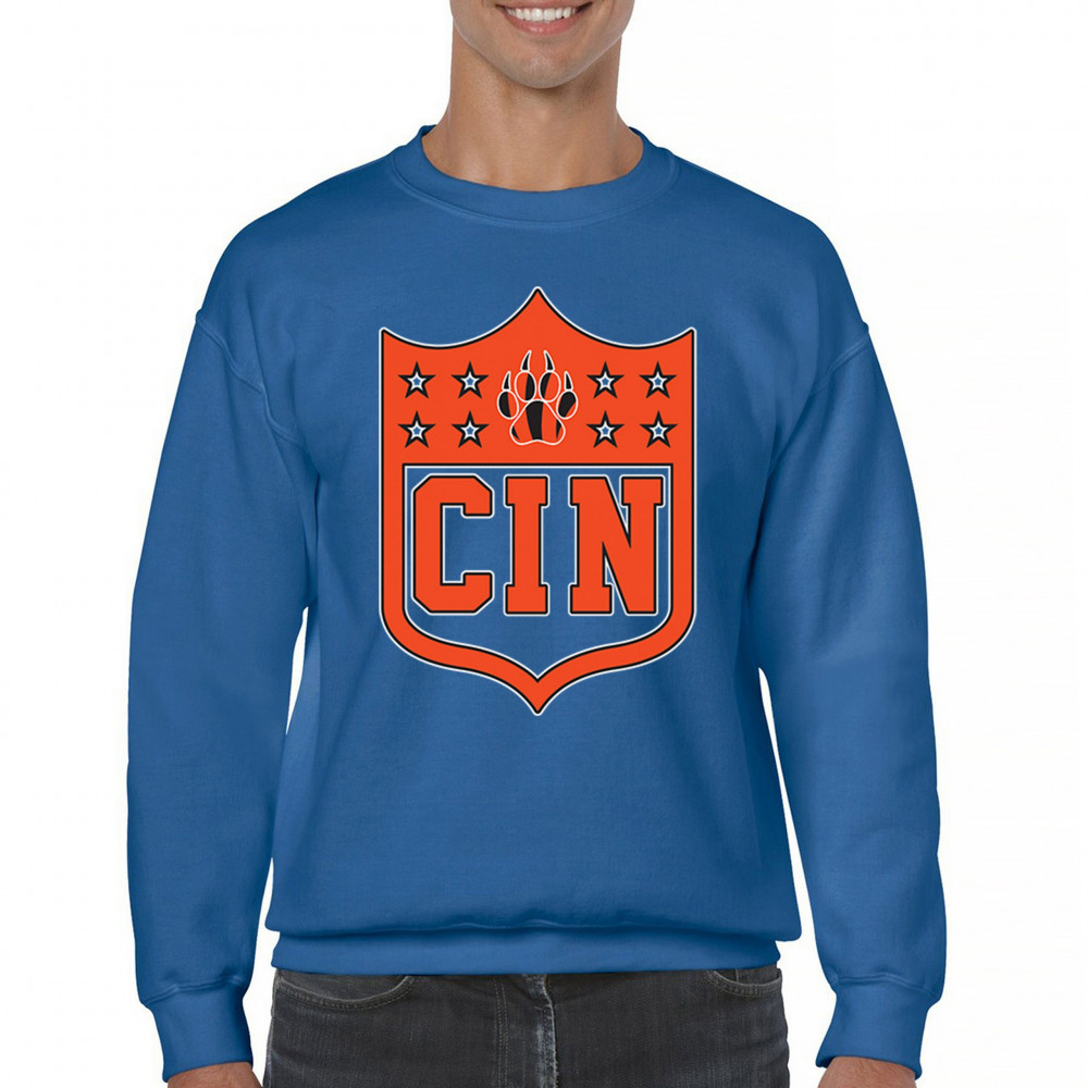 Bold CIN paw shield for Cincinnati football fans. Retro crest style, underdog spirit, and vintage game day gear for true Cincinnati grit.