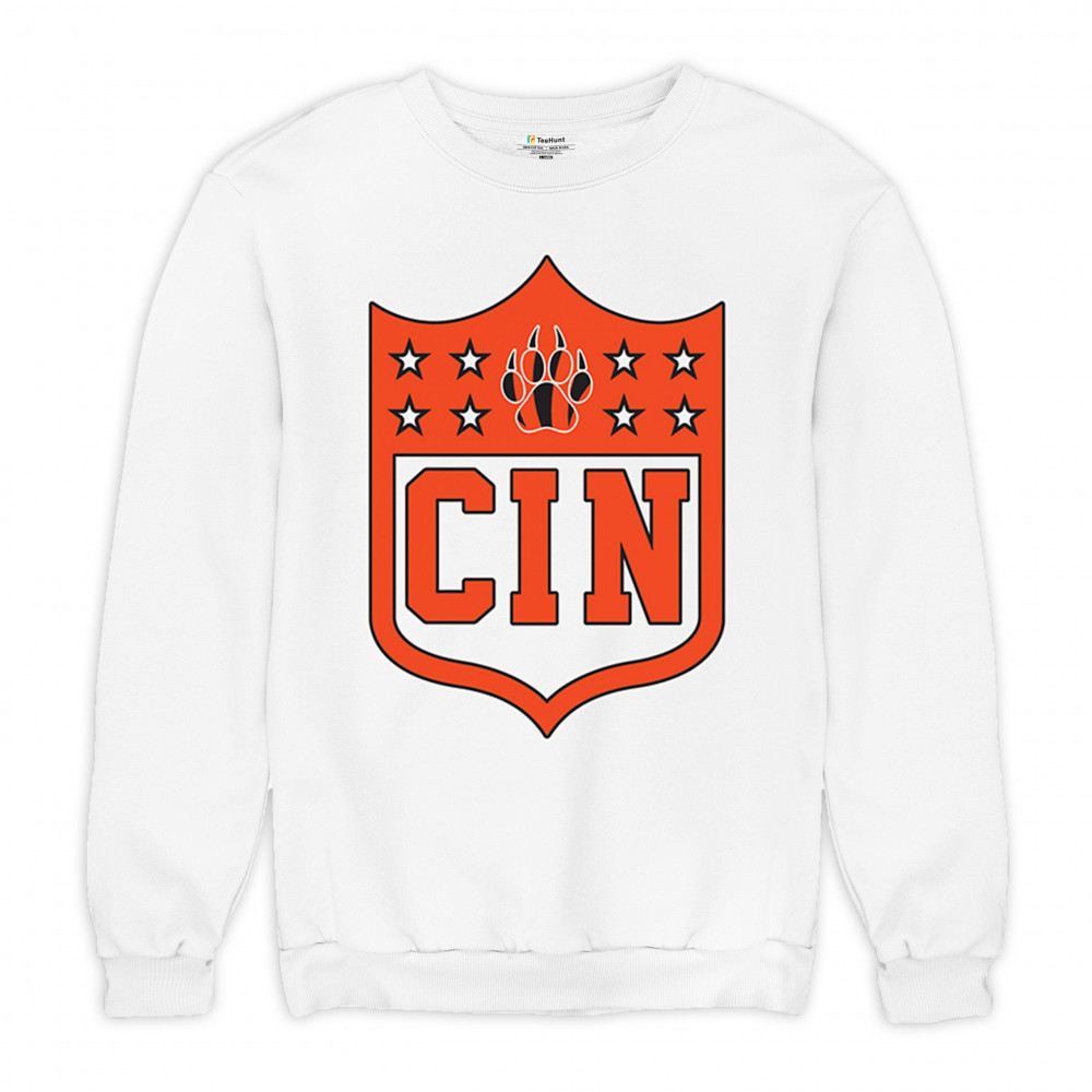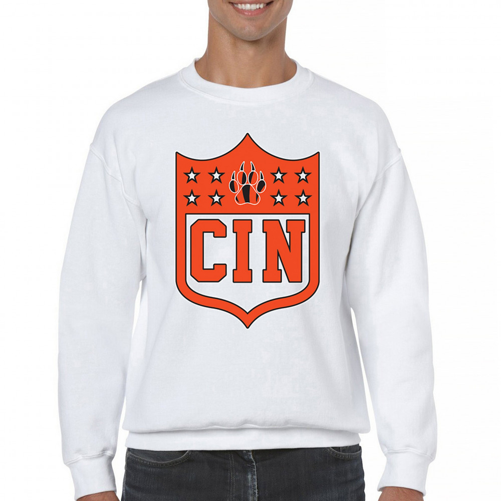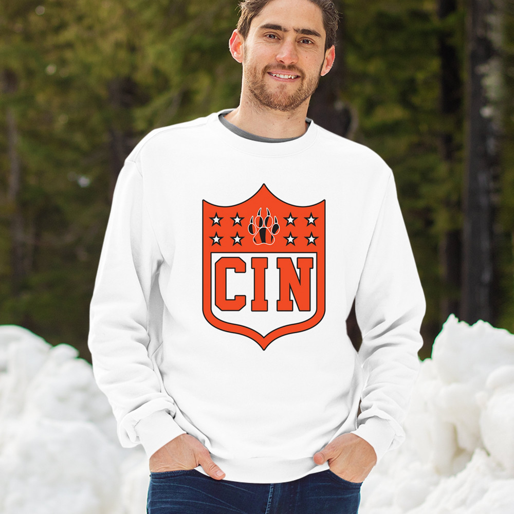 Bold CIN paw shield for Cincinnati football fans. Retro crest style, underdog spirit, and vintage game day gear for true Cincinnati grit.