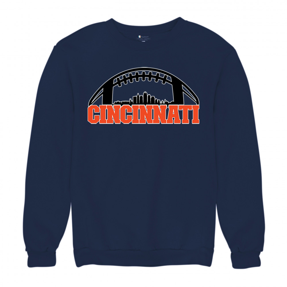 Celebrate Cincinnati and football with this bold skyline design under a football arch. Perfect for fans, tailgates, and game days!