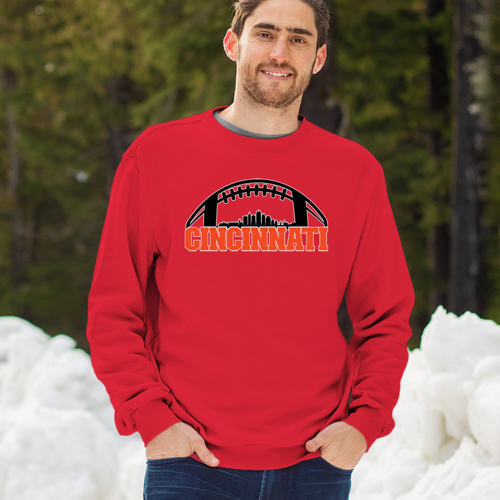 Discover the perfect blend of football passion and Cincinnati pride with this eye-catching design. Featuring the Queen City skyline under a bold football arch, this graphic is ideal for fans cheering on their team or celebrating their love for the city. Whether at a tailgate, game, or casual outing, this design lets you show your loyalty in style. A thoughtful gift for Cincinnati football enthusiasts!