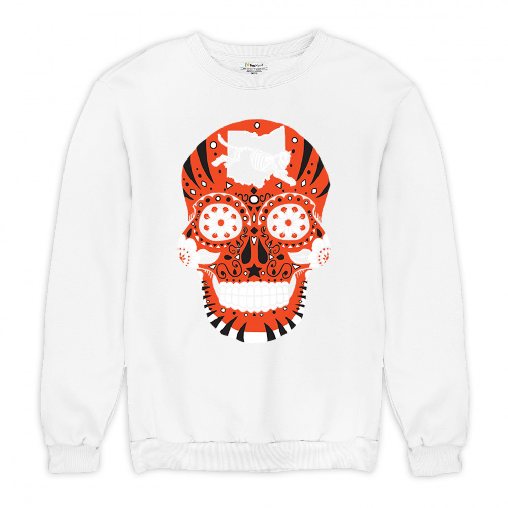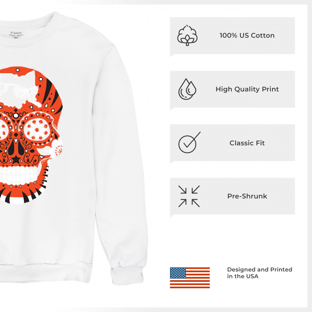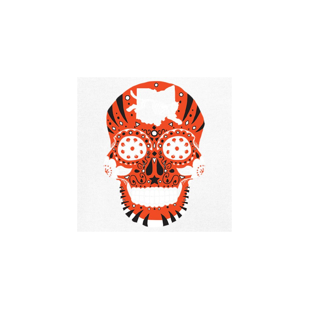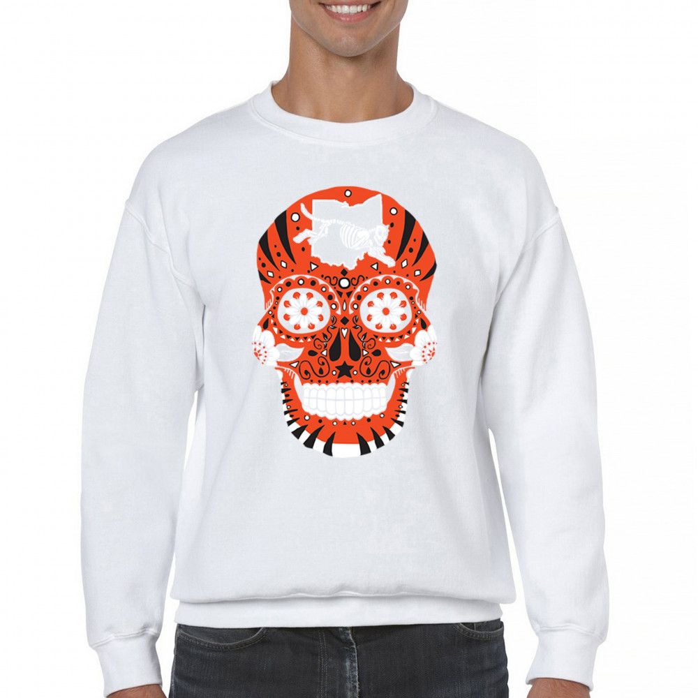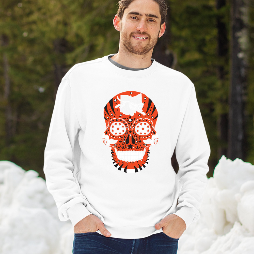 Cinci Sugar Skull with Queen City Paw, underdog grit, black & orange pride, Game Day energy, and playoff vibes.
