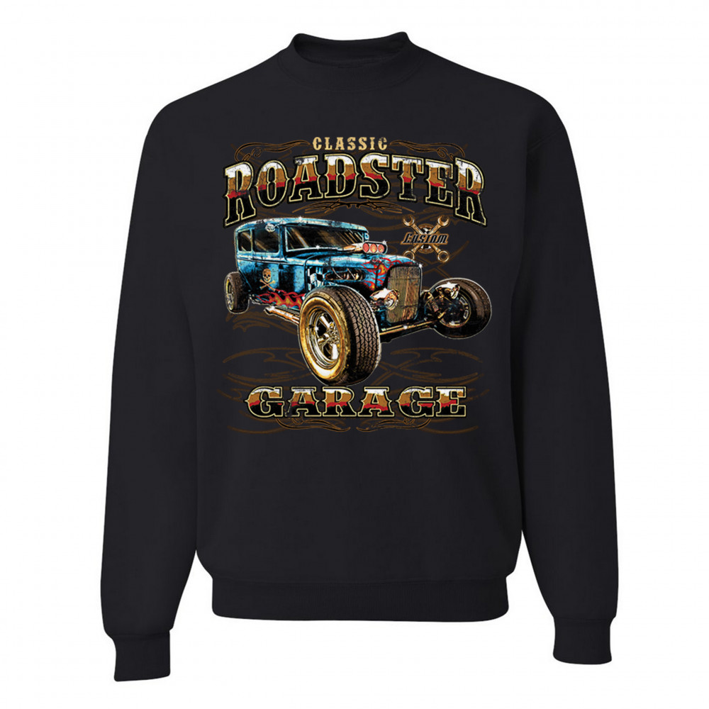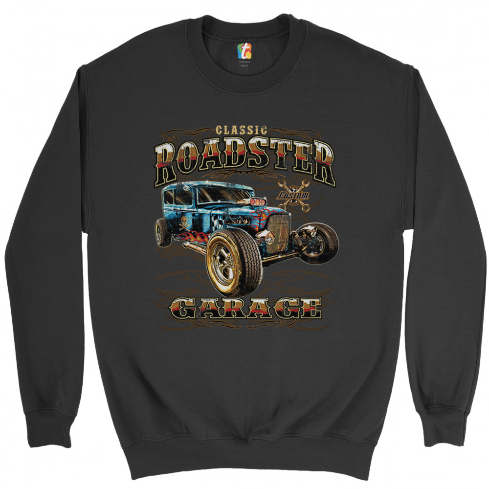 A print featuring a vintage-looking rat rod with flames and a skull with crossbones painted on it's side. "Classic Roadster" is written in the top and "Garage" in the bottom of the print. In the background there is a sign with crossed wrenches which says "custom". Great for Route 66 and hot rod fans.