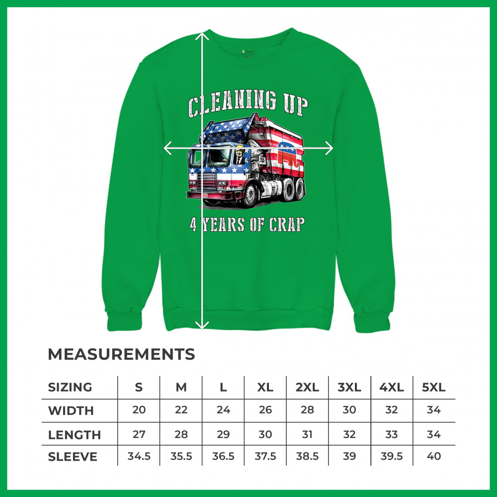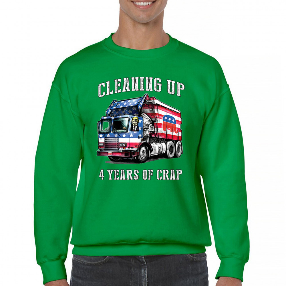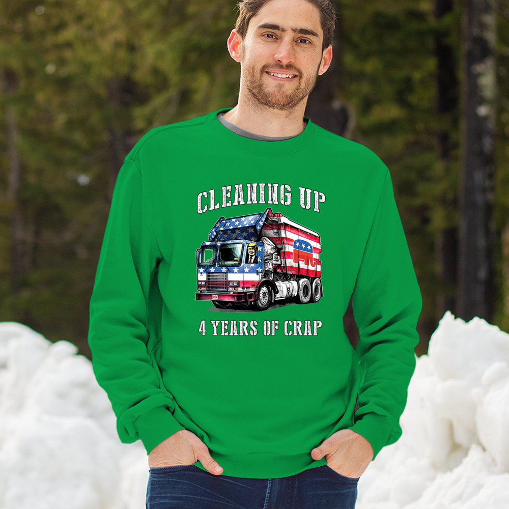 Bold "Cleaning Up 4 Years of Crap" design featuring Trump, the GOP, and the American flag. Perfect for proud conservatives and patriots.