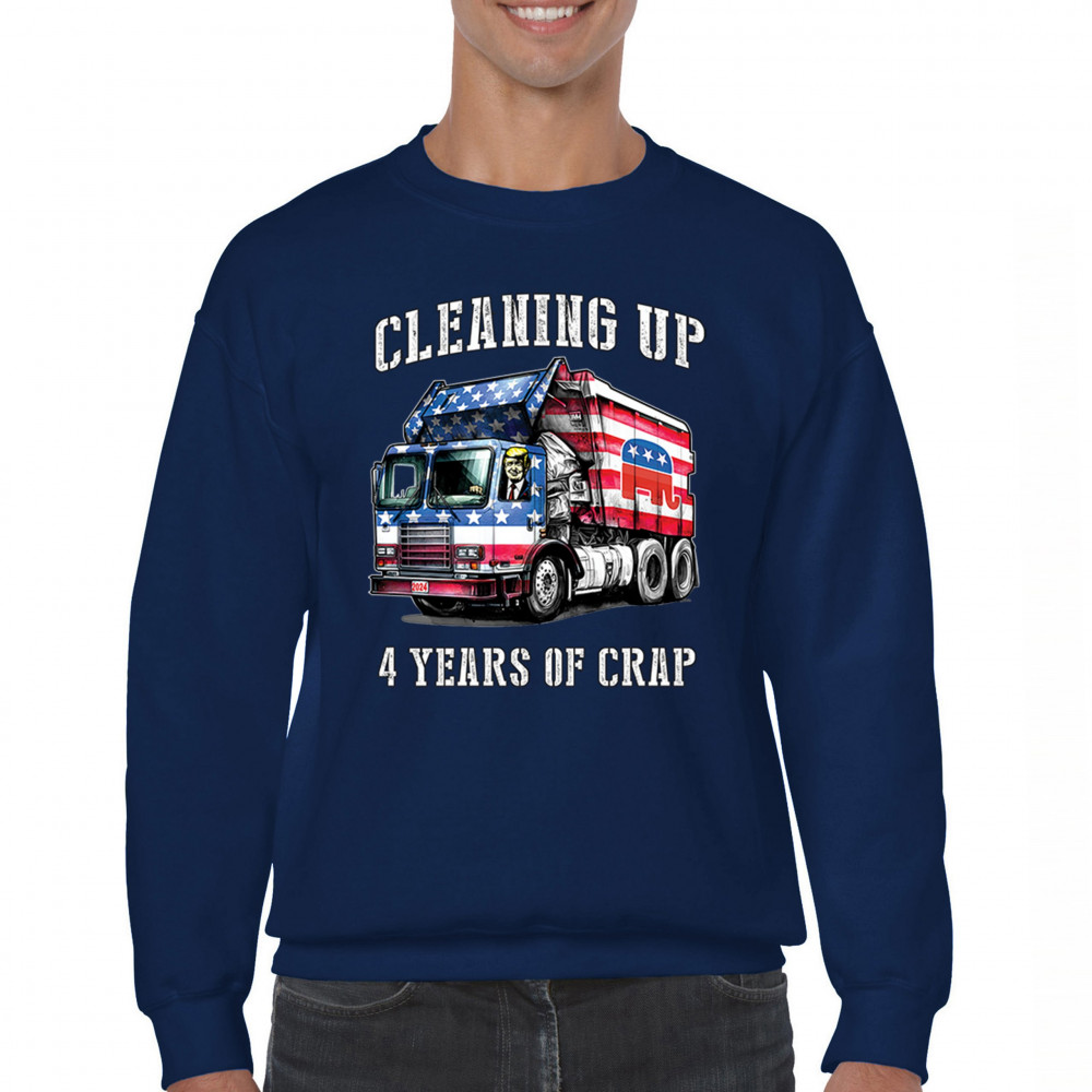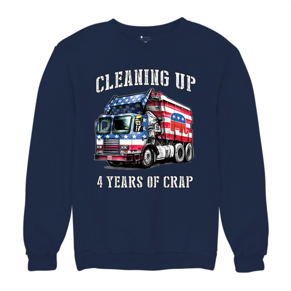 Bold "Cleaning Up 4 Years of Crap" design featuring Trump, the GOP, and the American flag. Perfect for proud conservatives and patriots.