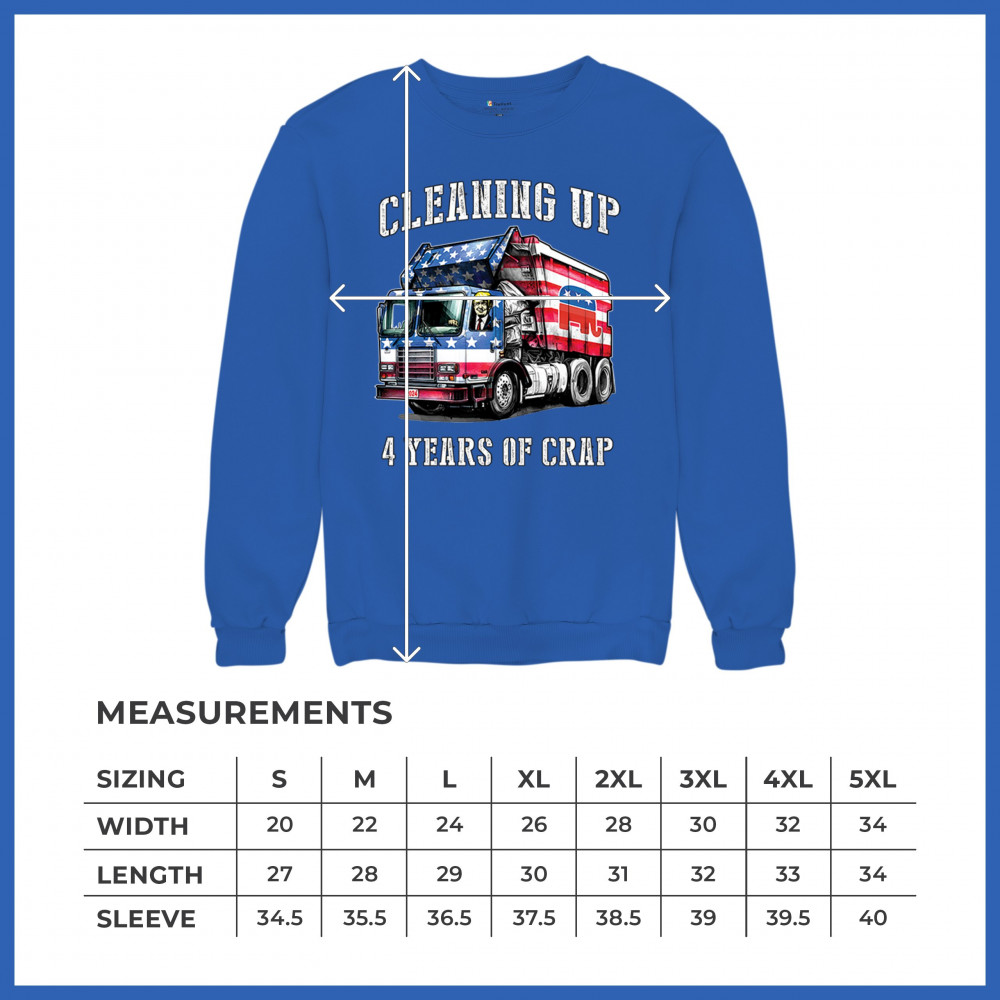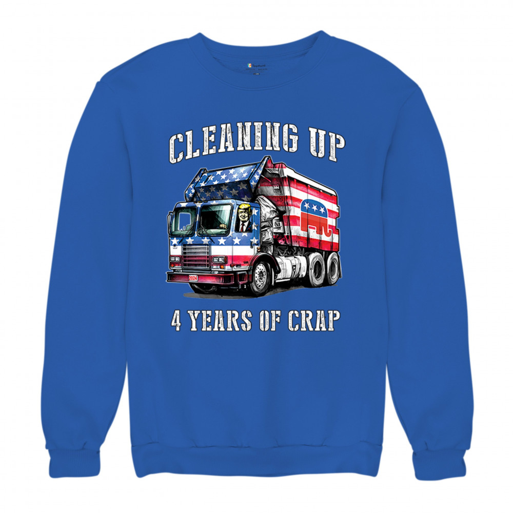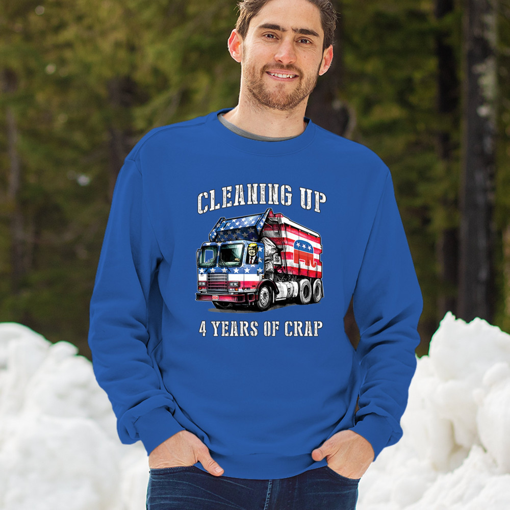 Bold "Cleaning Up 4 Years of Crap" design featuring Trump, the GOP, and the American flag. Perfect for proud conservatives and patriots.